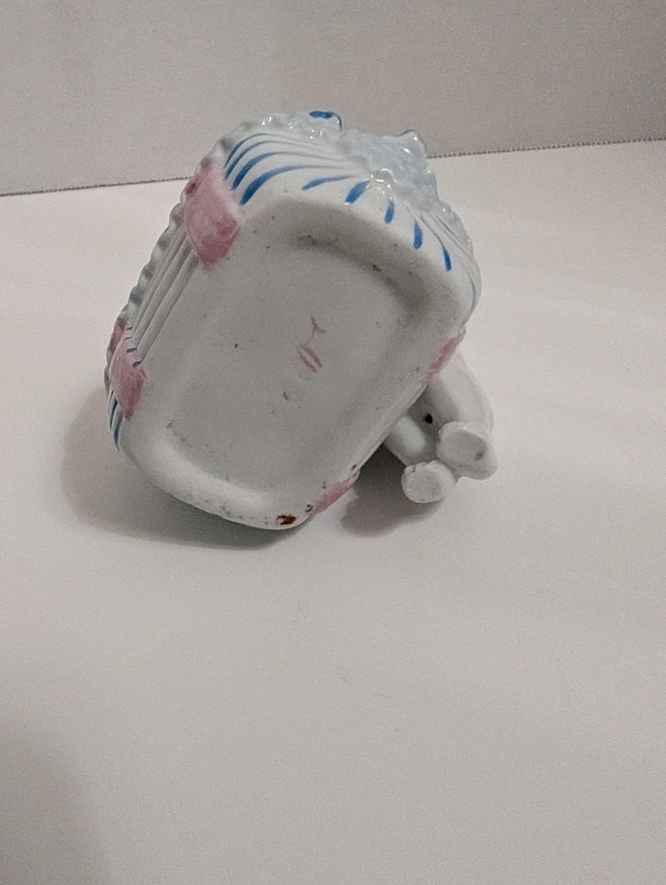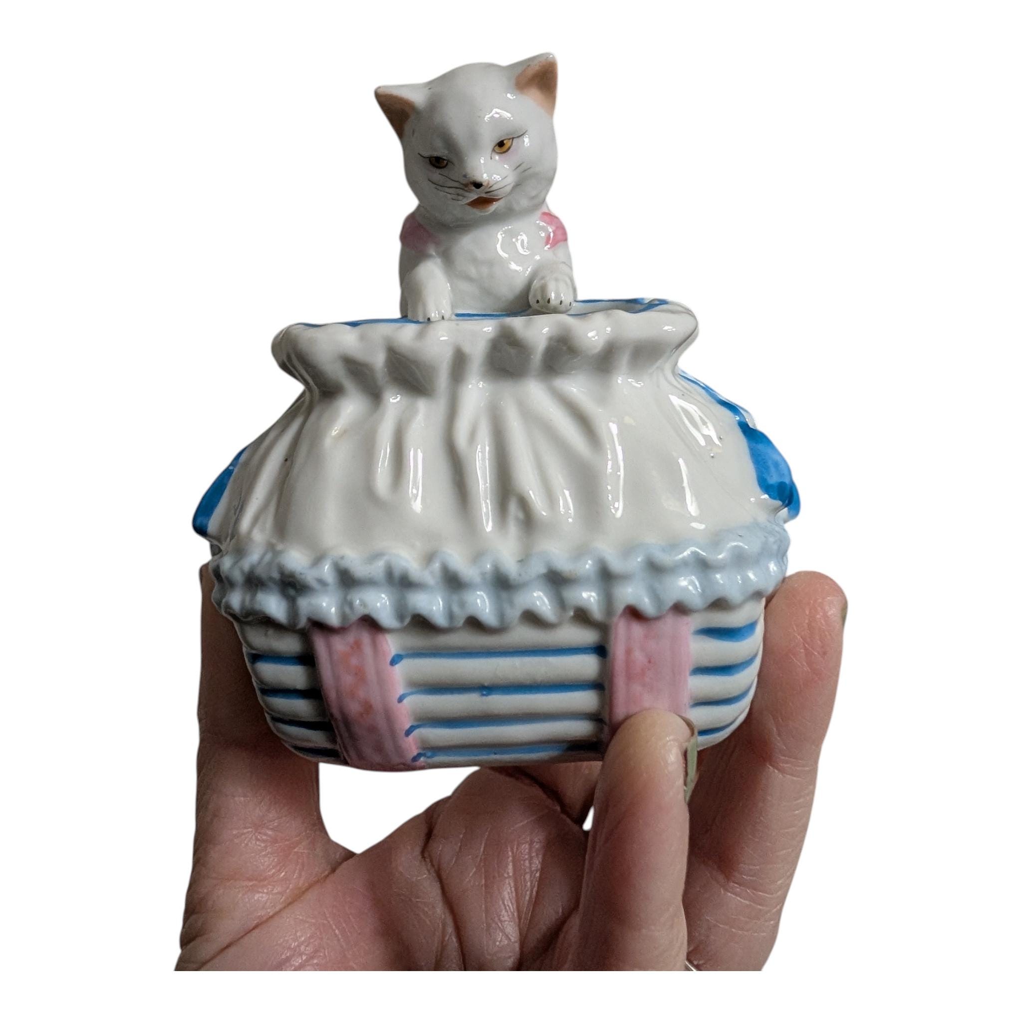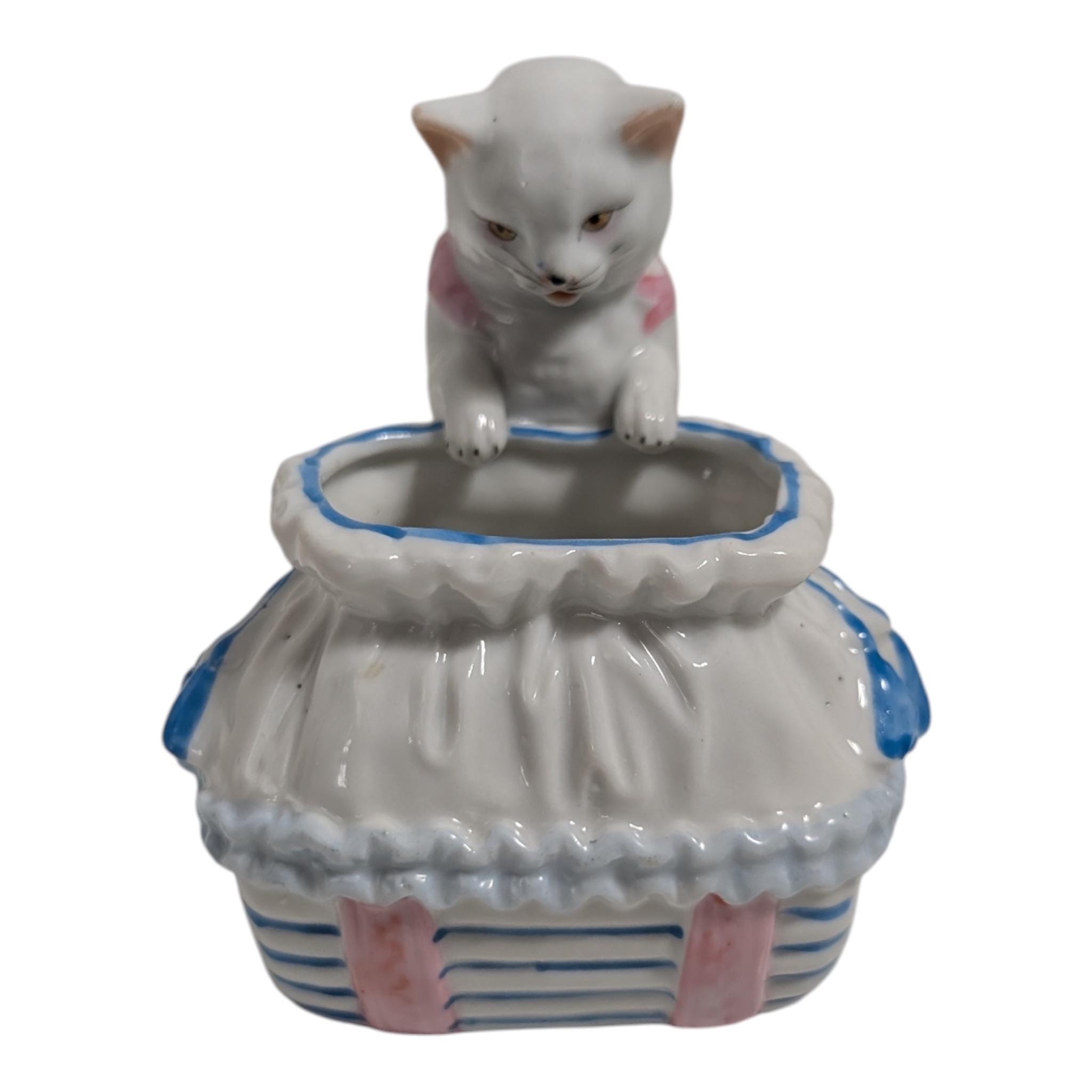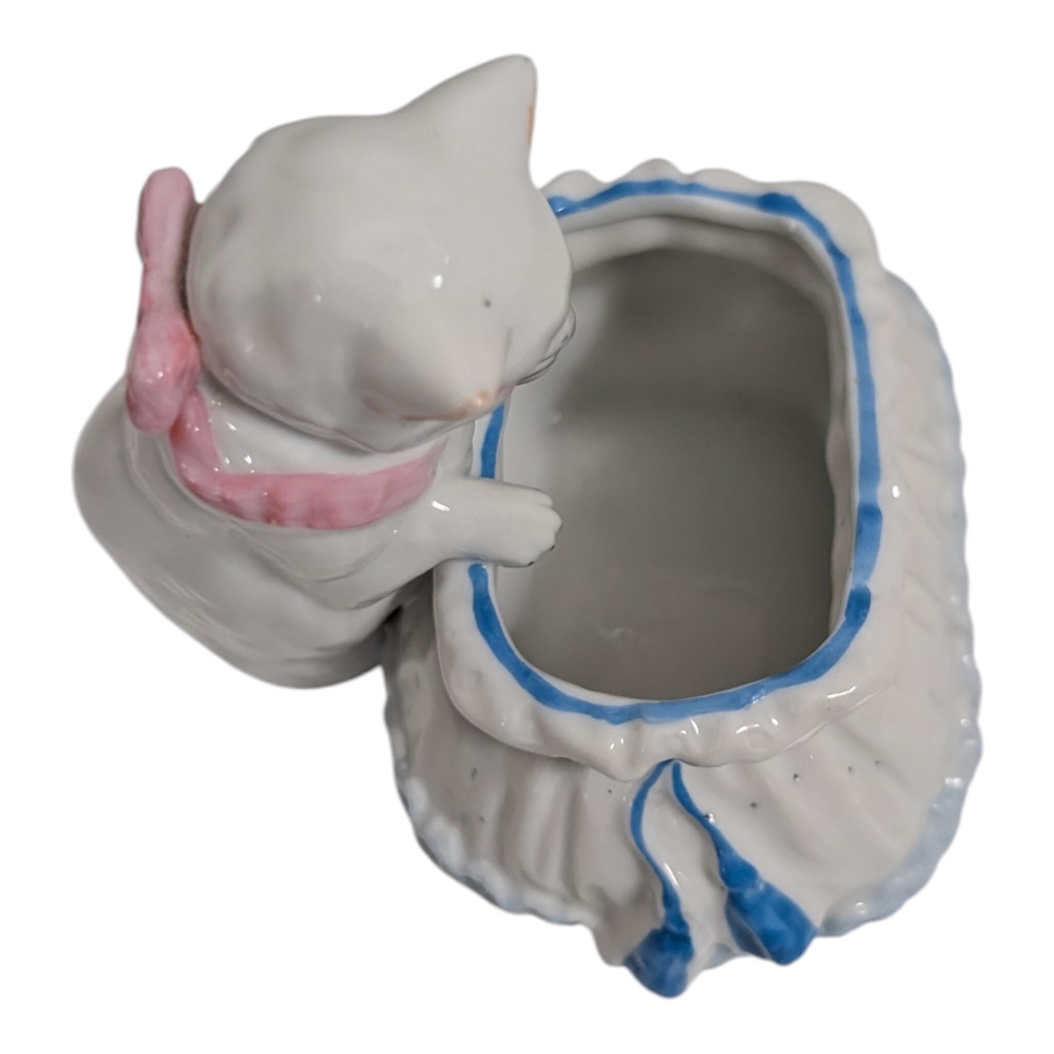 Vintage Mid Century Cat With Basket - Anthropomorphic White Kitten with Baby Bassinet -Pink and Blue - Nursery Decor or Trinket Dish