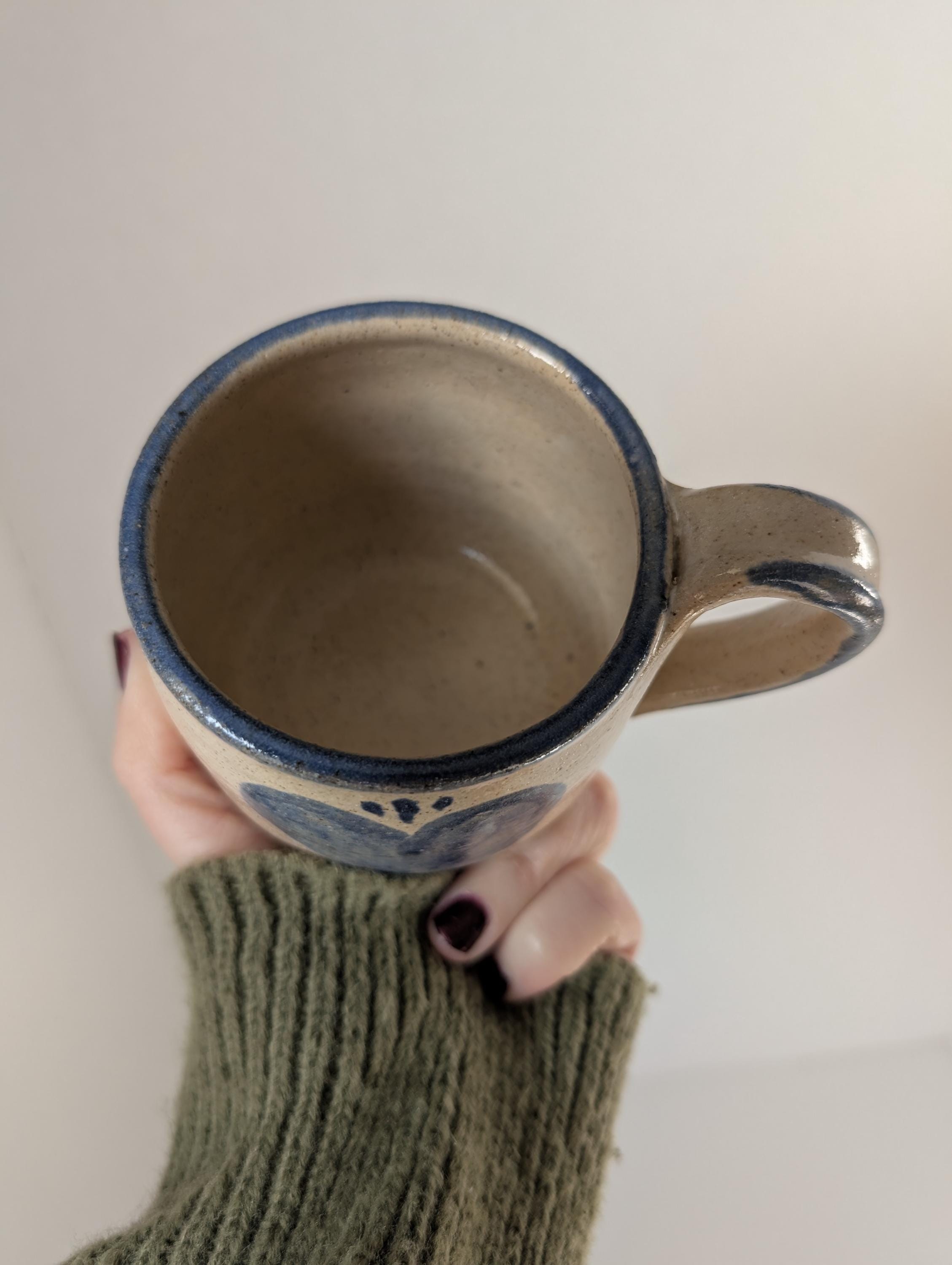 Bring the "New Nostalgia" into your morning routine with this beautifully hand-thrown stoneware mug. Signed by the artist, Bolin, this piece is a stunning example of American studio pottery, featuring a classic folk-art cobalt blue heart that radiates warmth and hospitality.