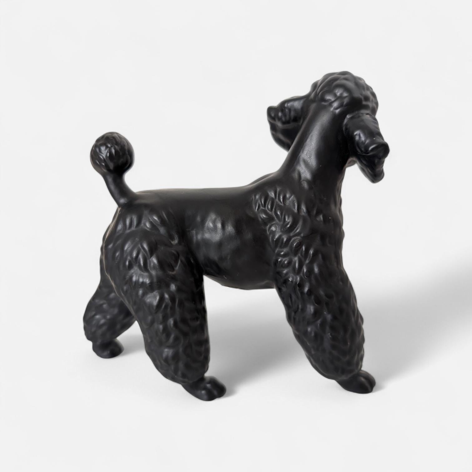 The sleek, semi-matte finish and textured "poodle clip" coat provide beautiful contrast against wood shelving and leather-bound books. This is a substantial piece with hand-painted details and the model number 17326 stamped on the base.