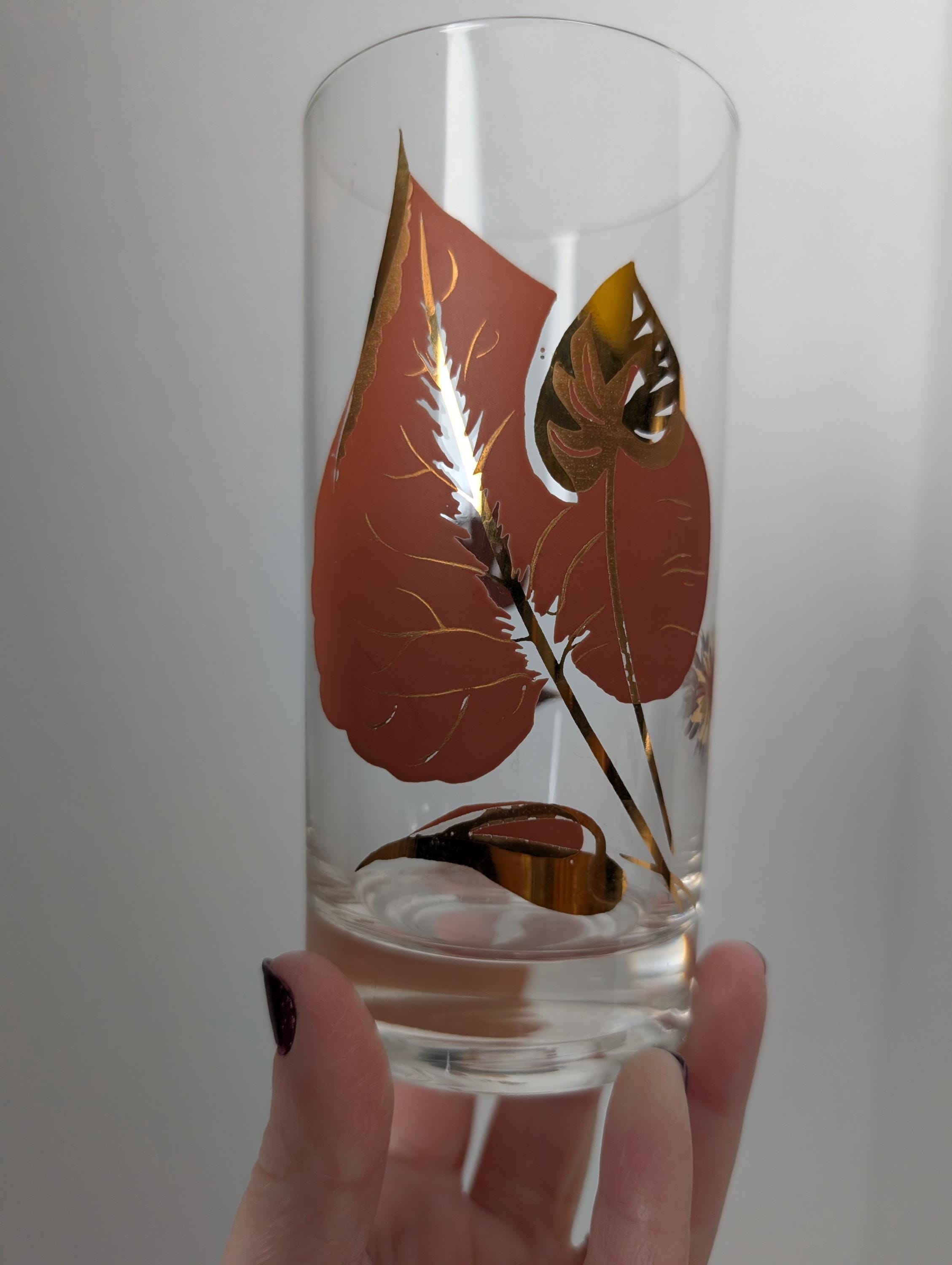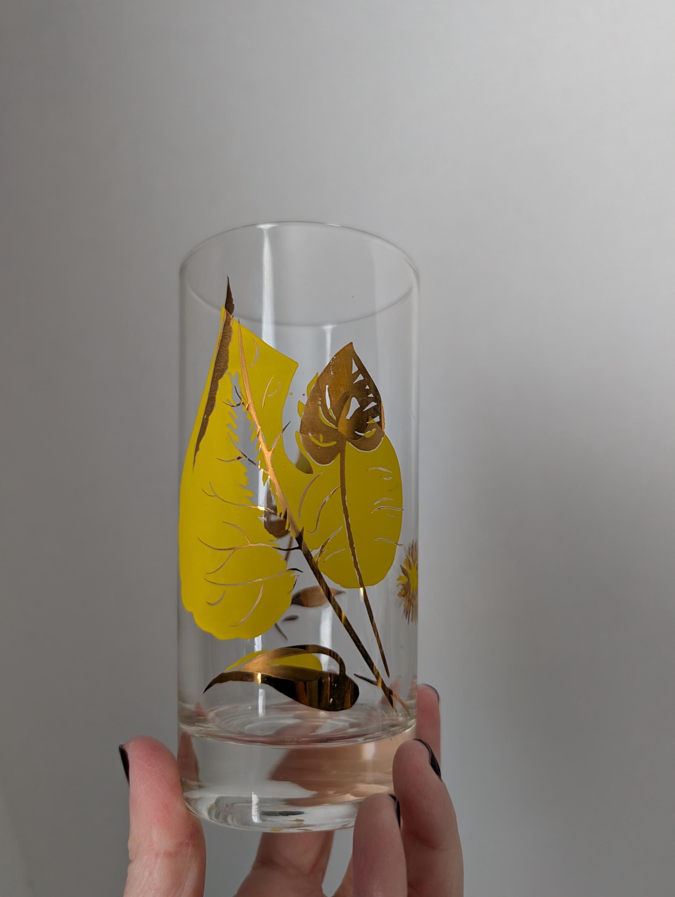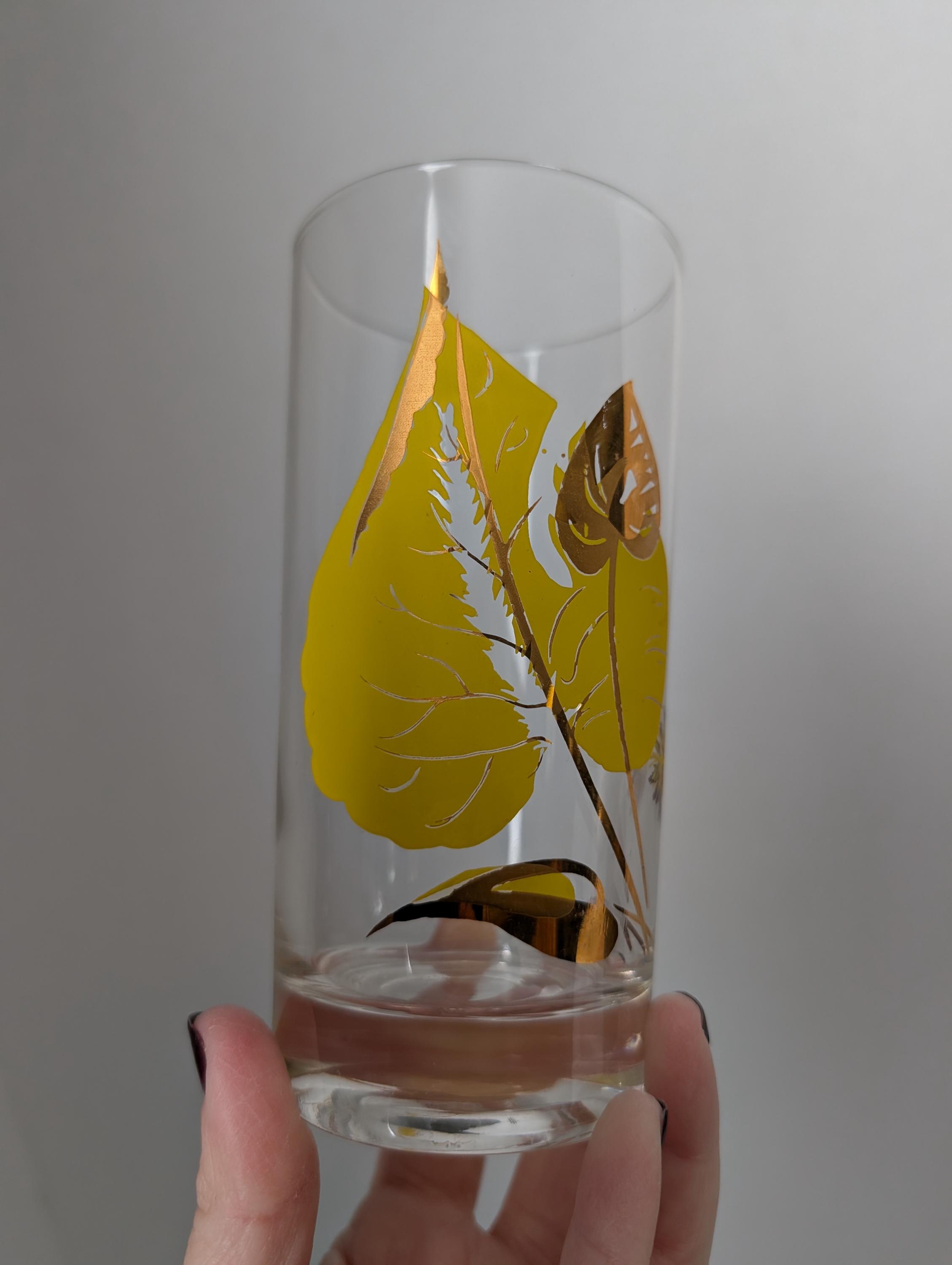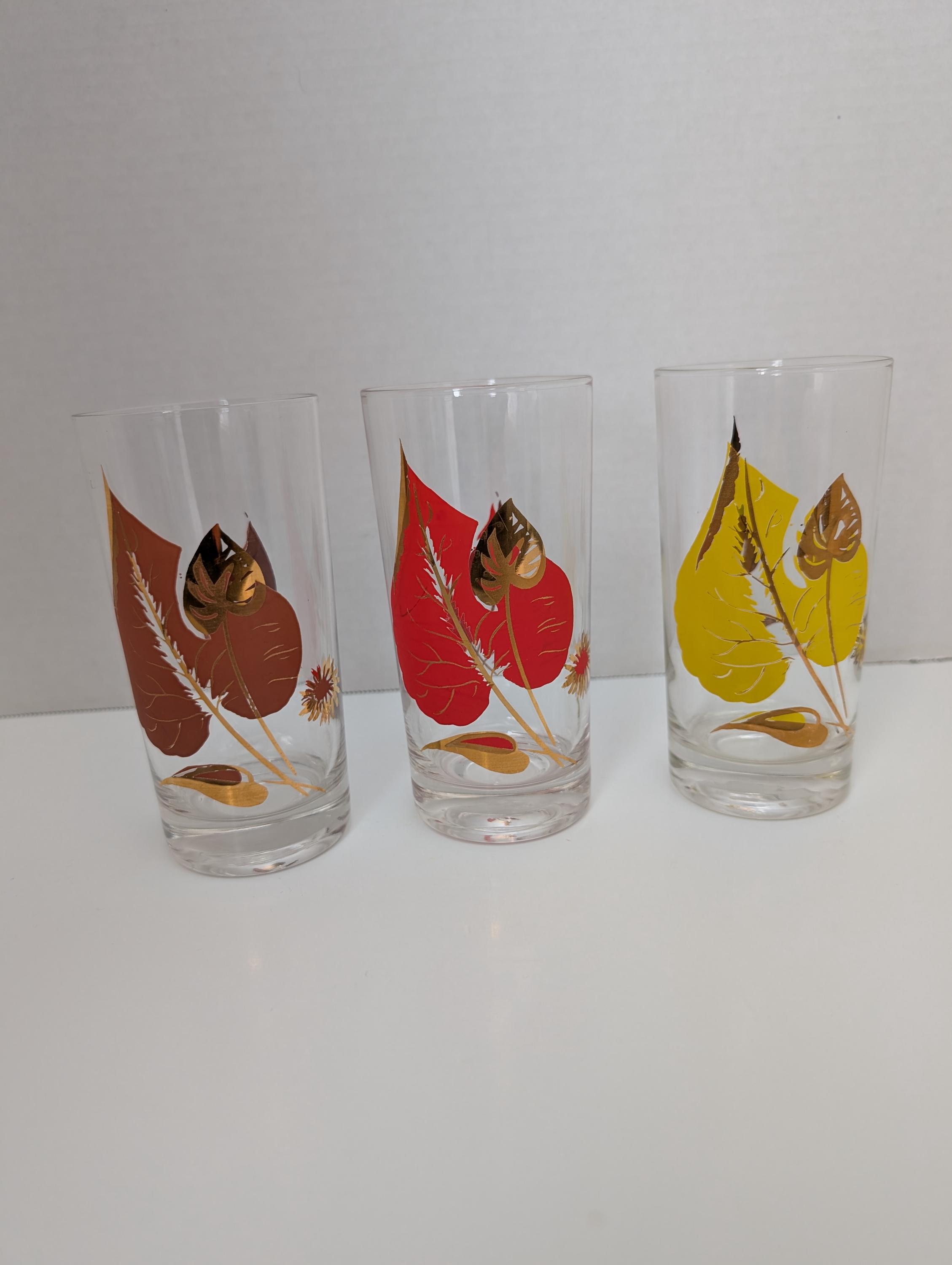 Set of 3 Vintage Federal Glass Highball Glasses - Mid Century Modern Gold Leaf Tumblers - MCM Atomic Leaf Barware