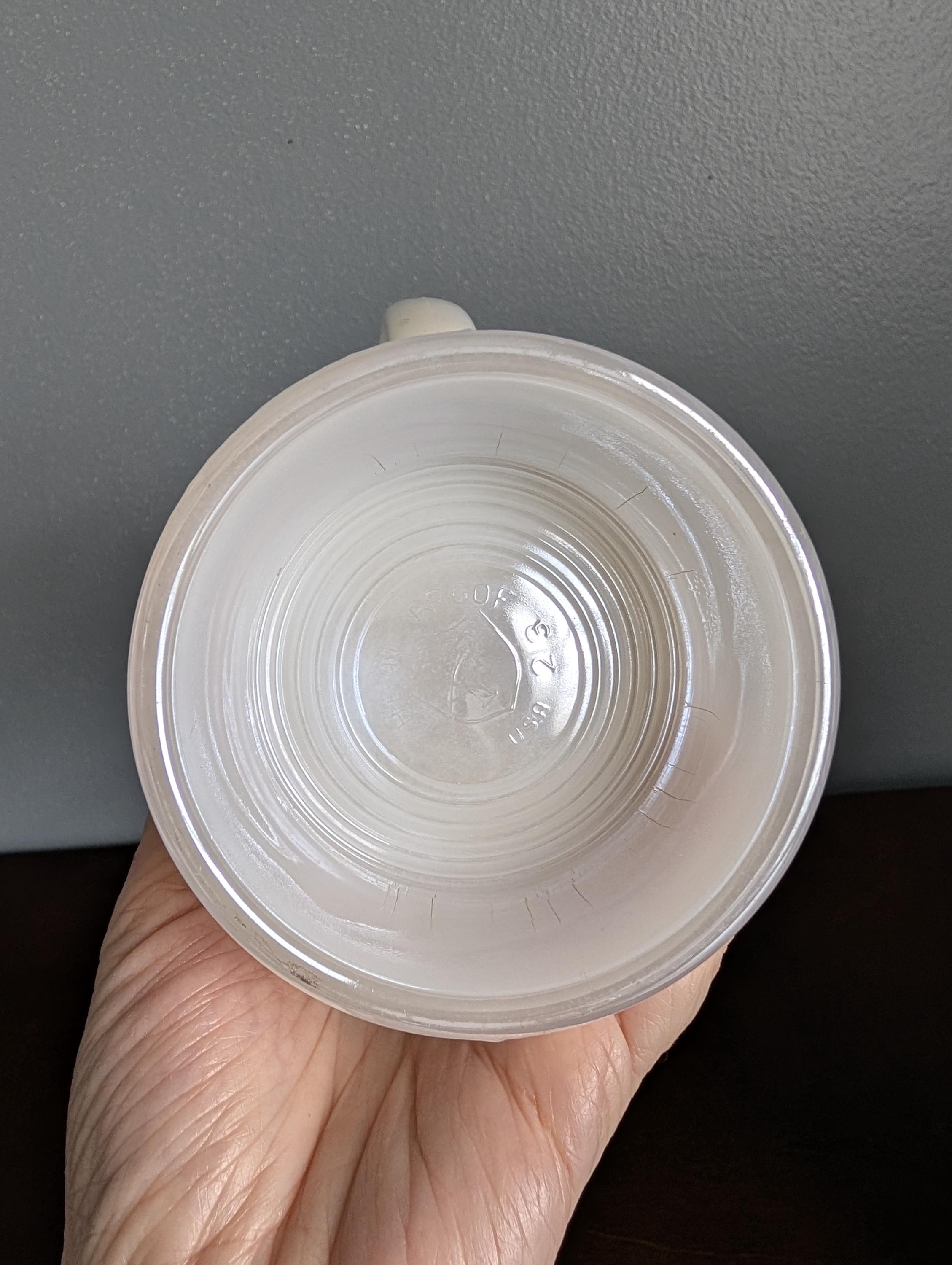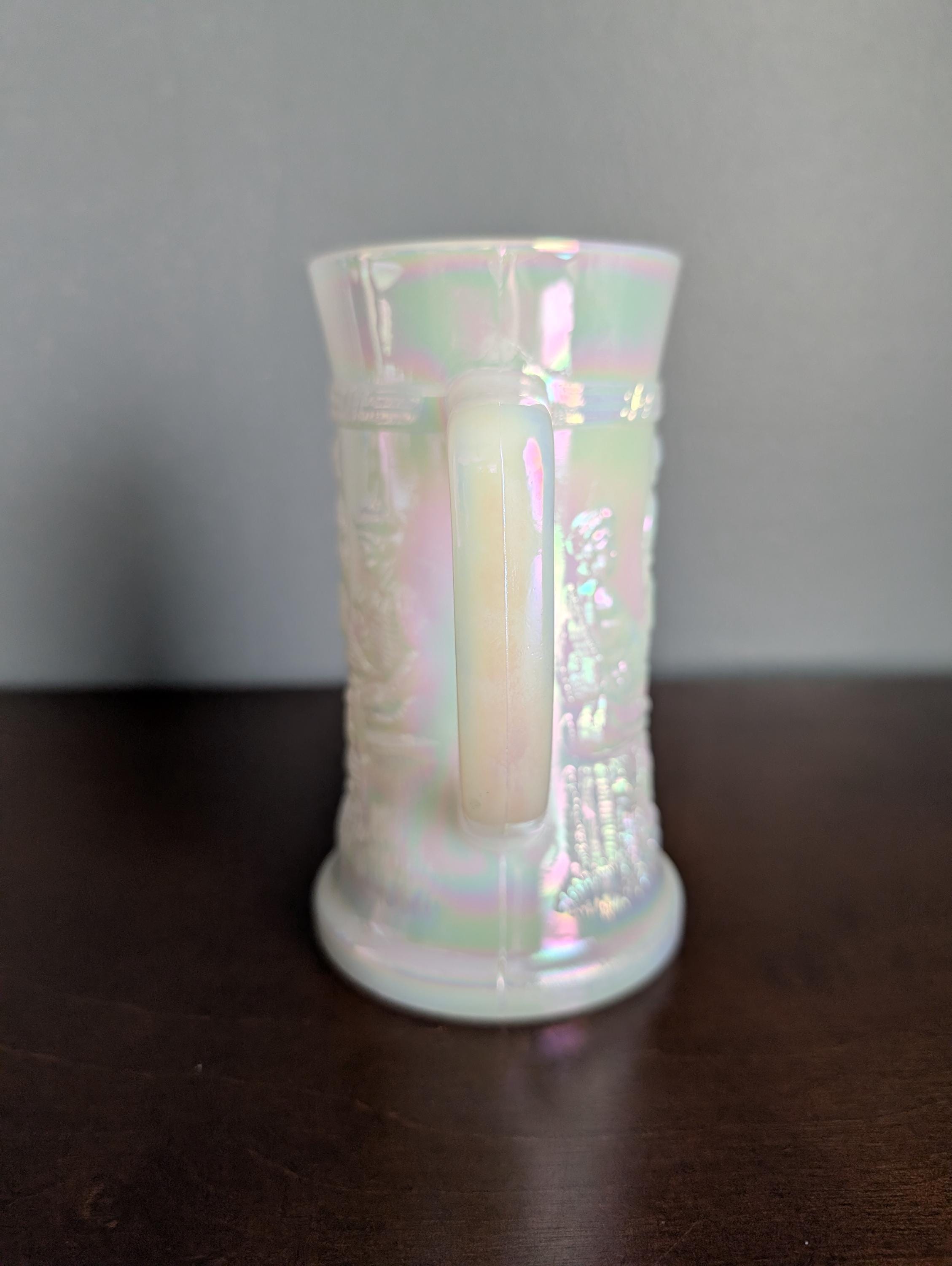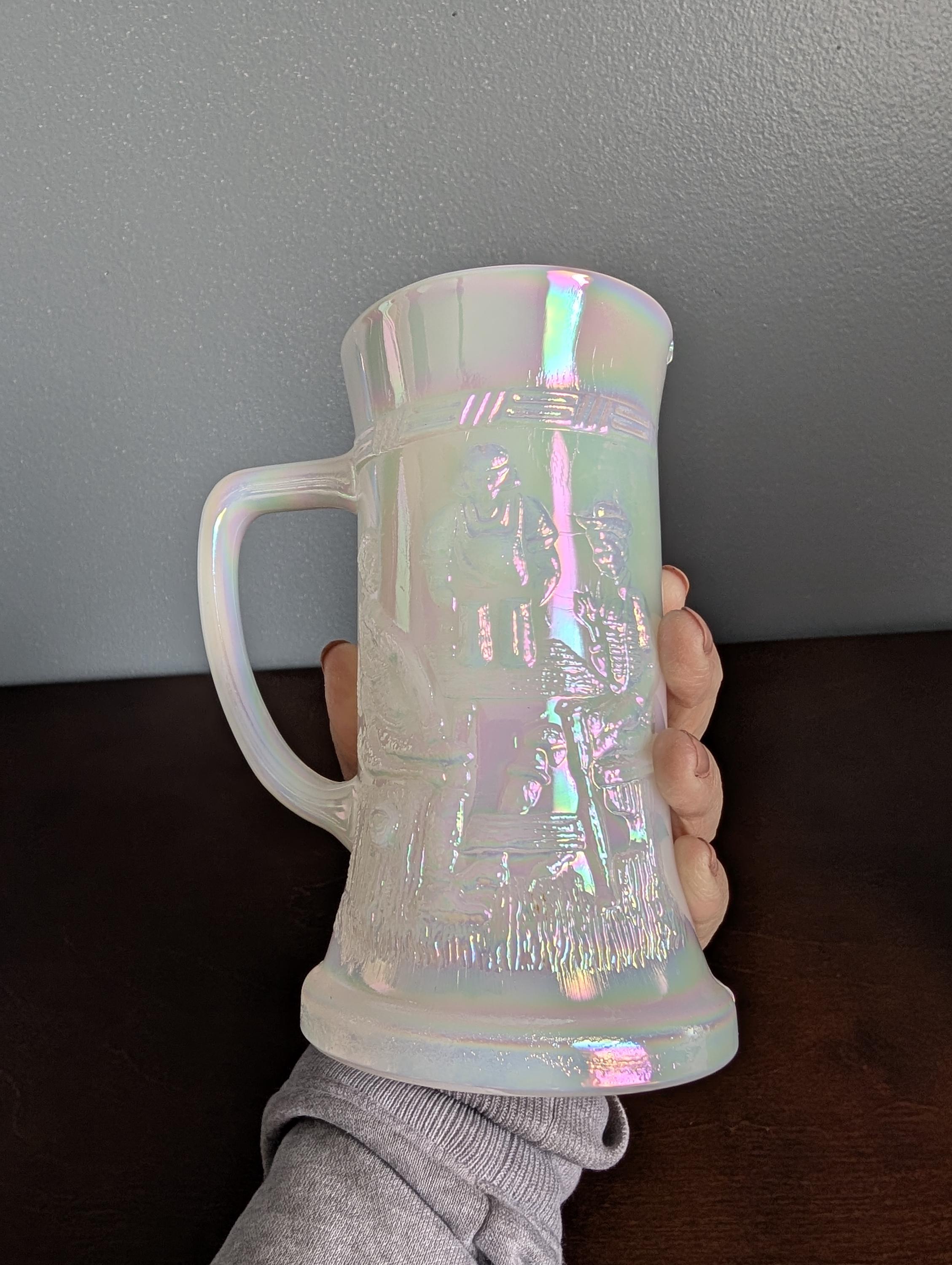 Mid Century Federal Glass Moon Glow Iridescent Tavern Scene Stein Tankard Milk Glass Beer Mug White Luster Vintage
