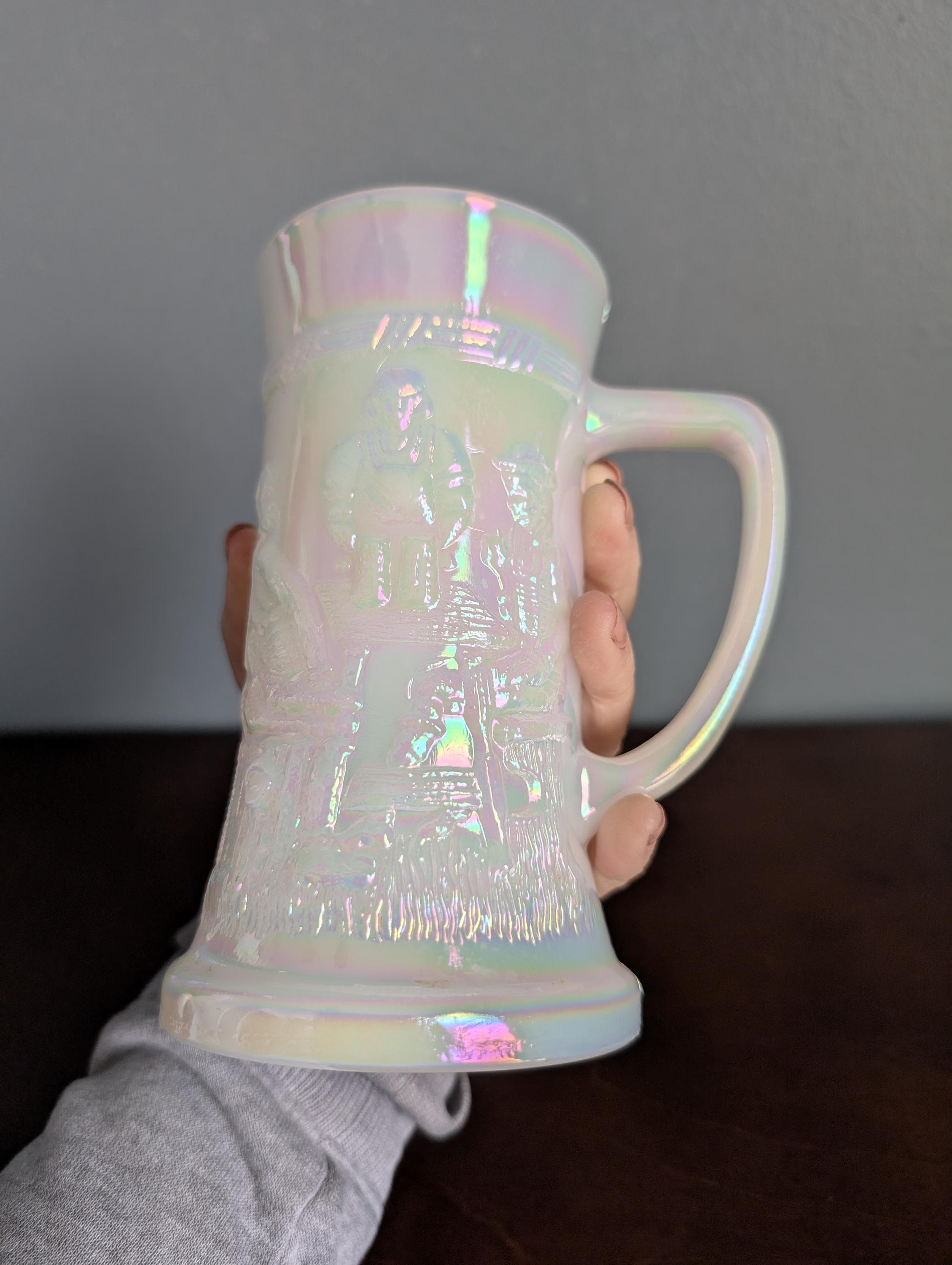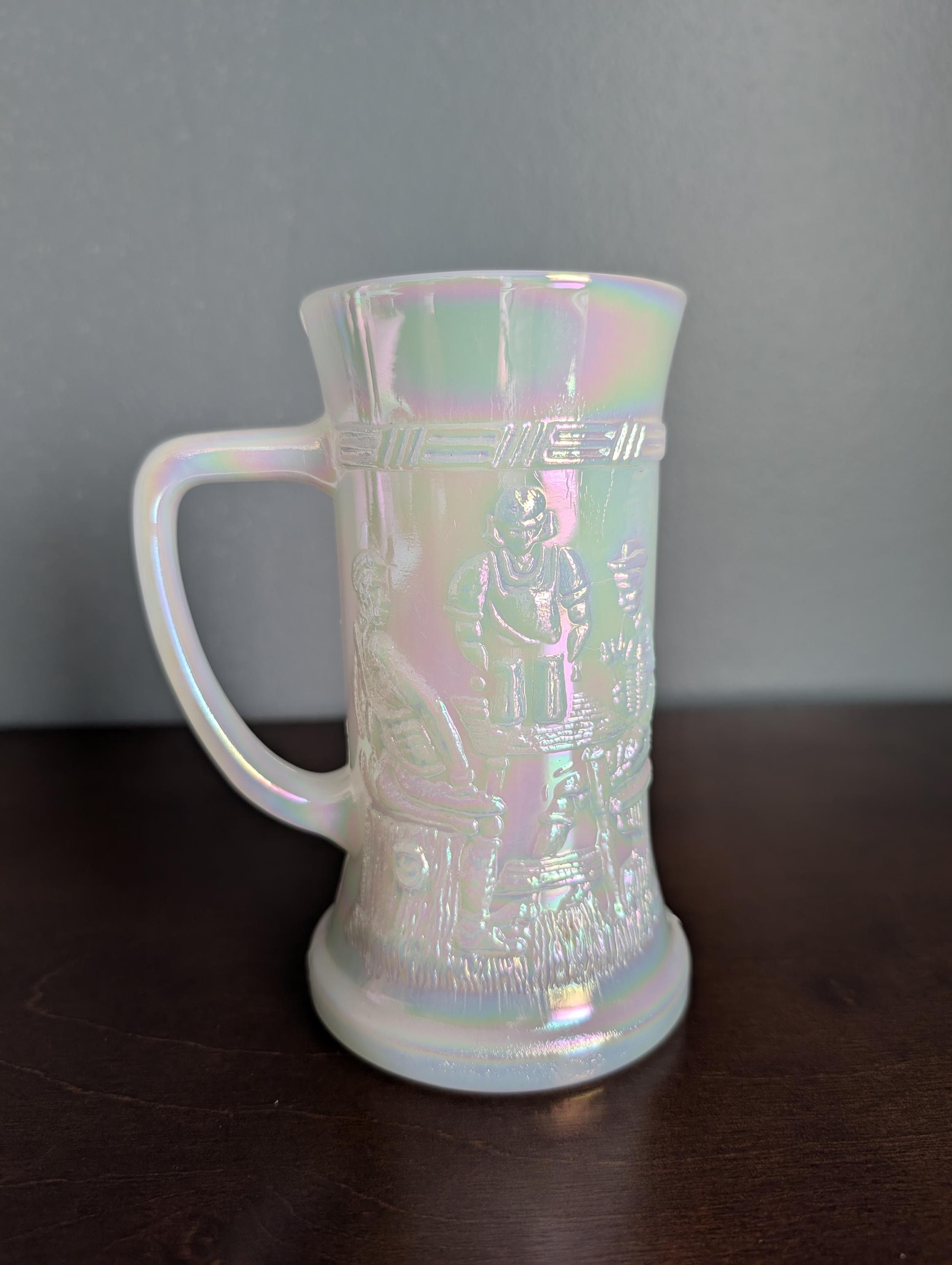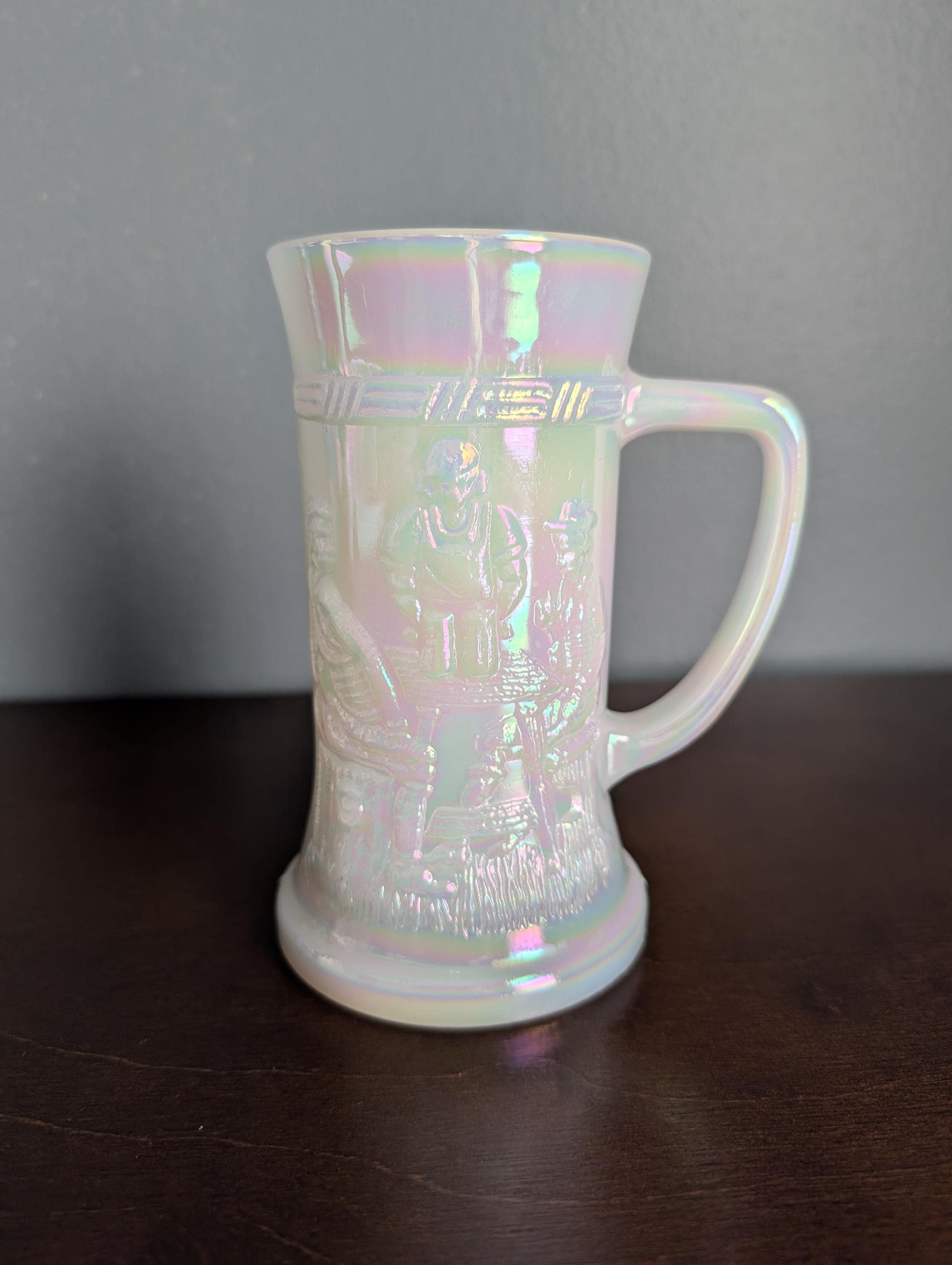 The body of the mug is decorated with a highly detailed, embossed tavern scene featuring figures in a traditional pub setting. This is a heavy, substantial piece that feels great in the hand—perfect for use or as a display piece.Excellent vintage condition. No chips or cracks. The iridescent finish is bright and intact. Please see photos for the Federal Glass "F in a shield" hallmark on the base.Dimensions: Approximately 6" Tall. AAC