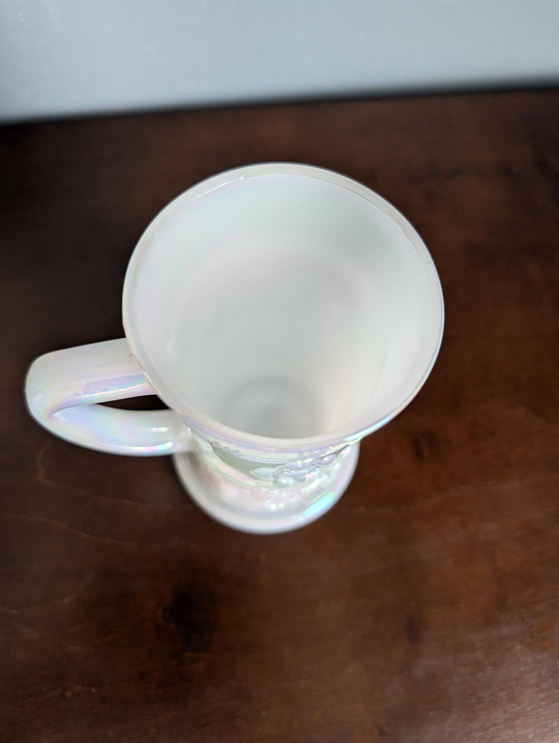 Add a touch of Mid-Century charm to your barware collection with this stunning Federal Glass "Moon Glow" tankard. This milk glass stein features a beautiful iridescent luster finish that catches the light with soft pinks, blues, and yellows.