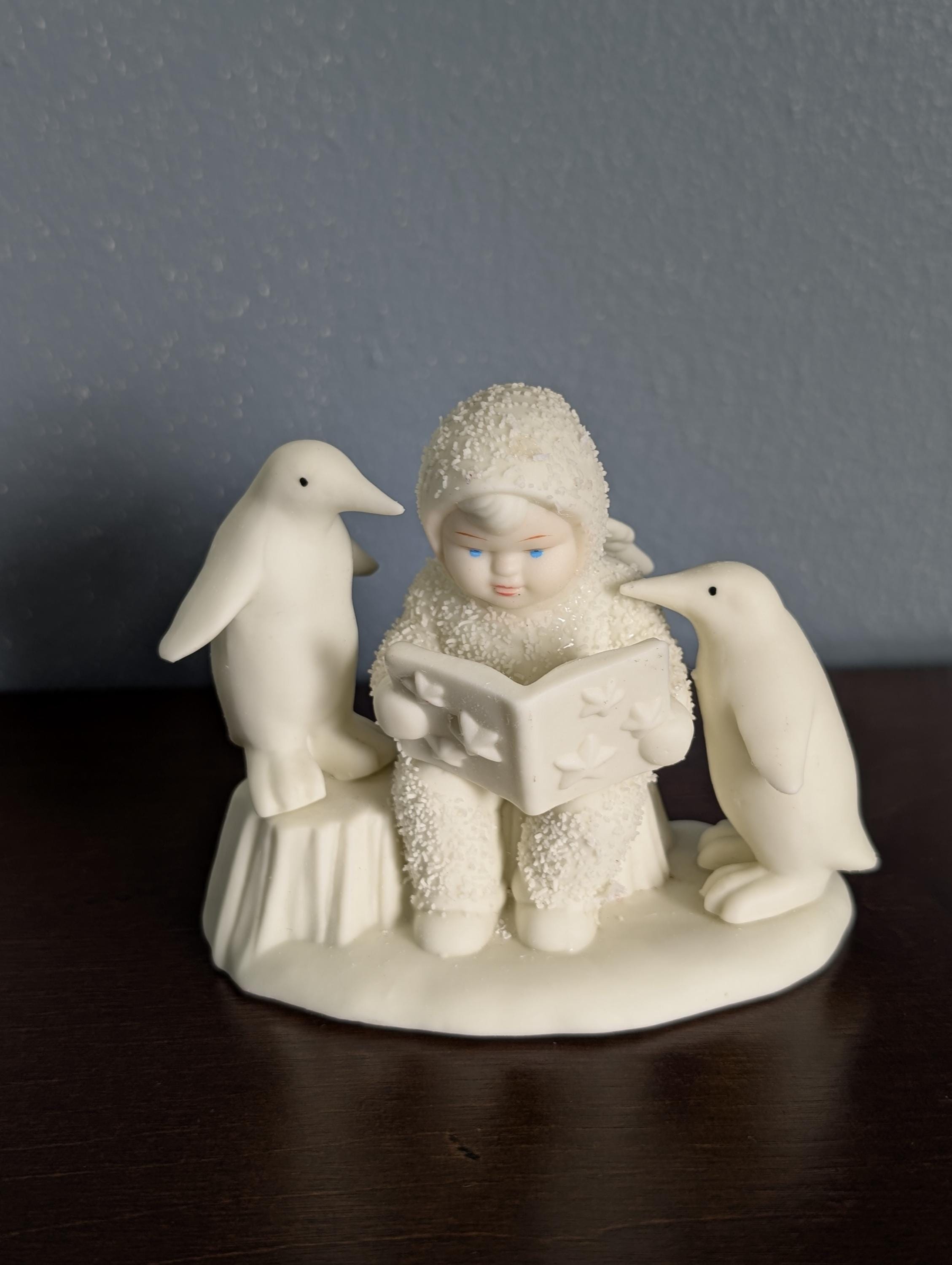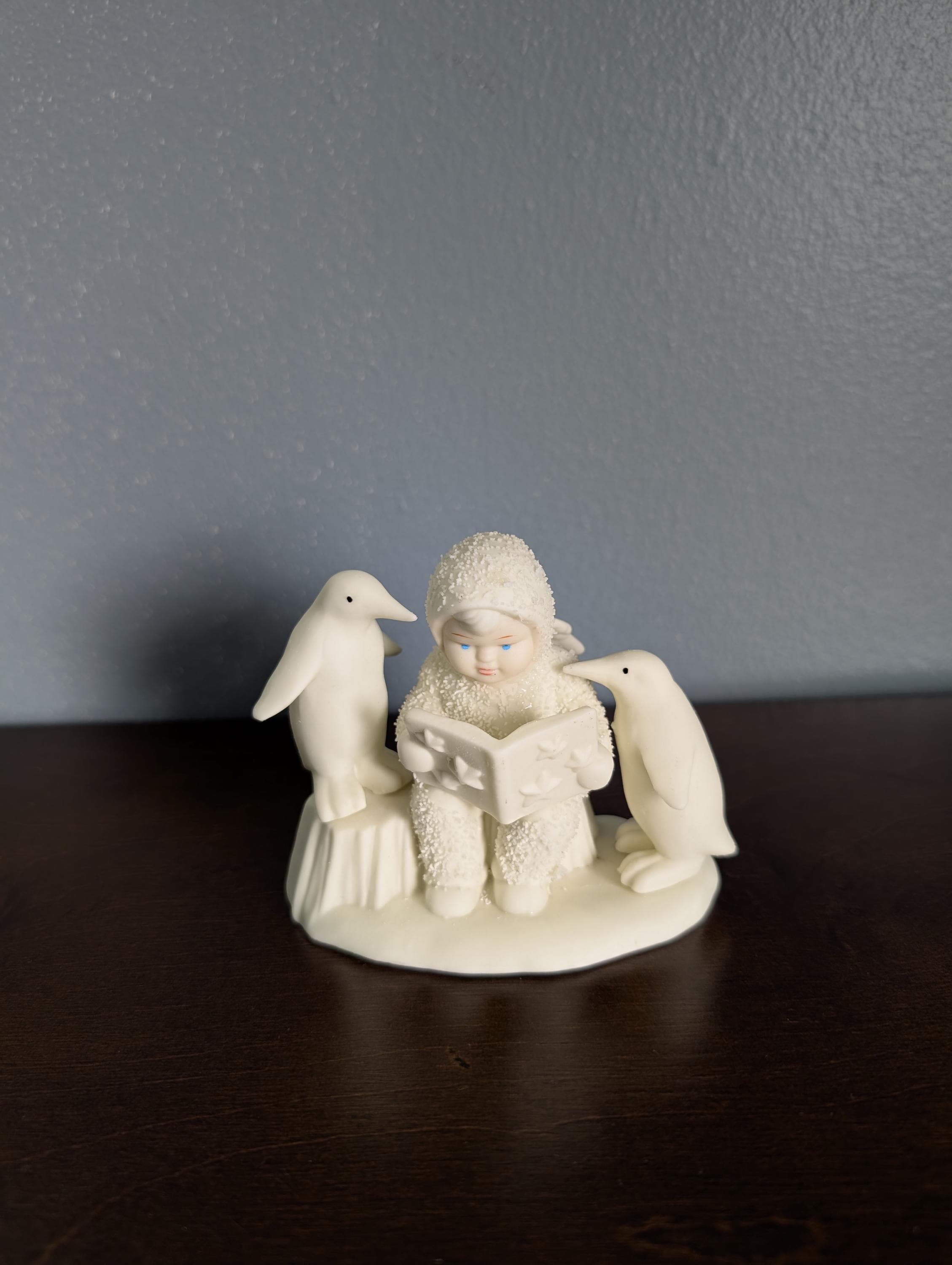 Vintage Dept 56 Snowbabies "Read Me a Story" Figurine - Retired 1990s Winter Tales - Bisque Porcelain Child Reading to Penguins