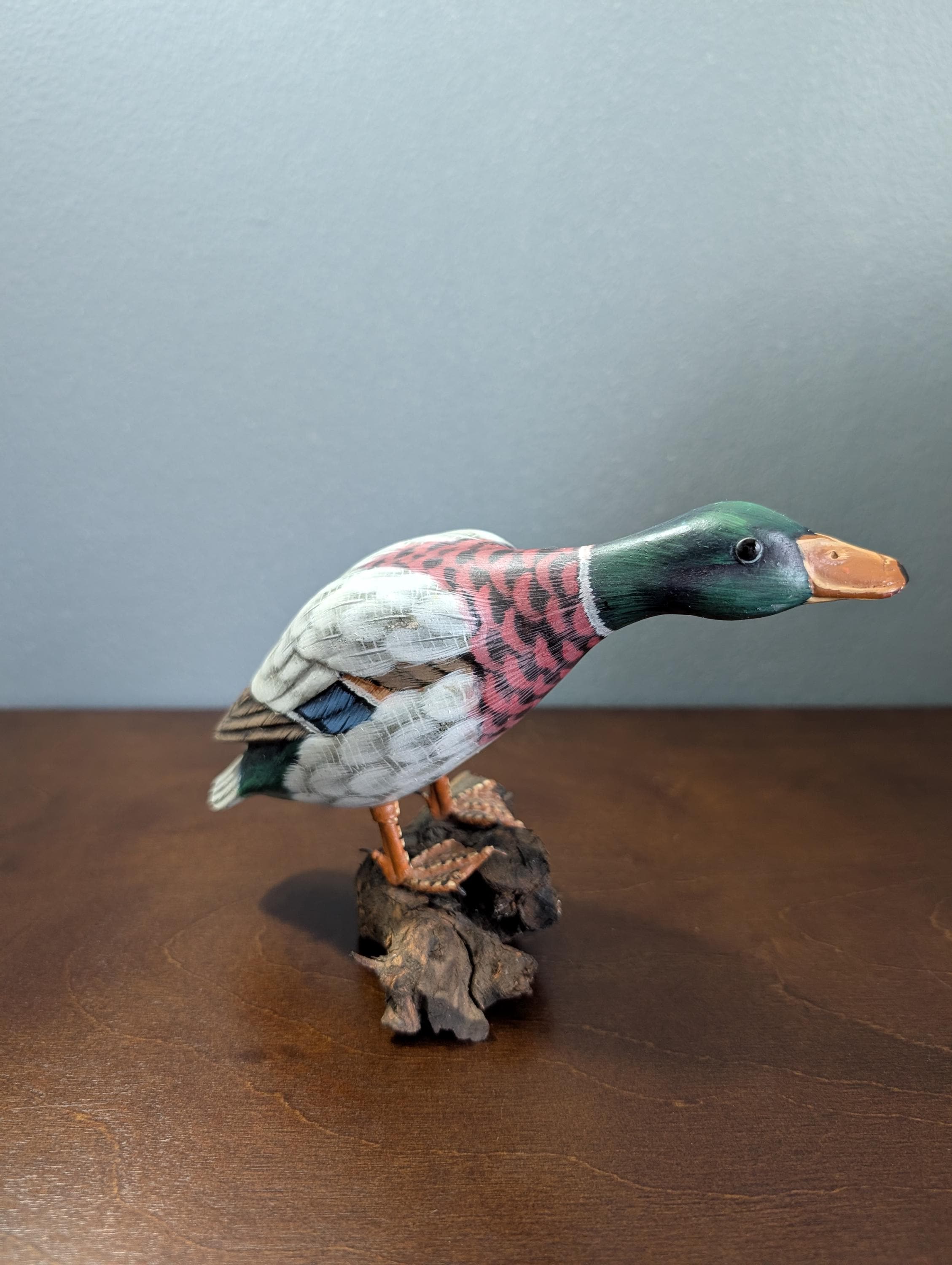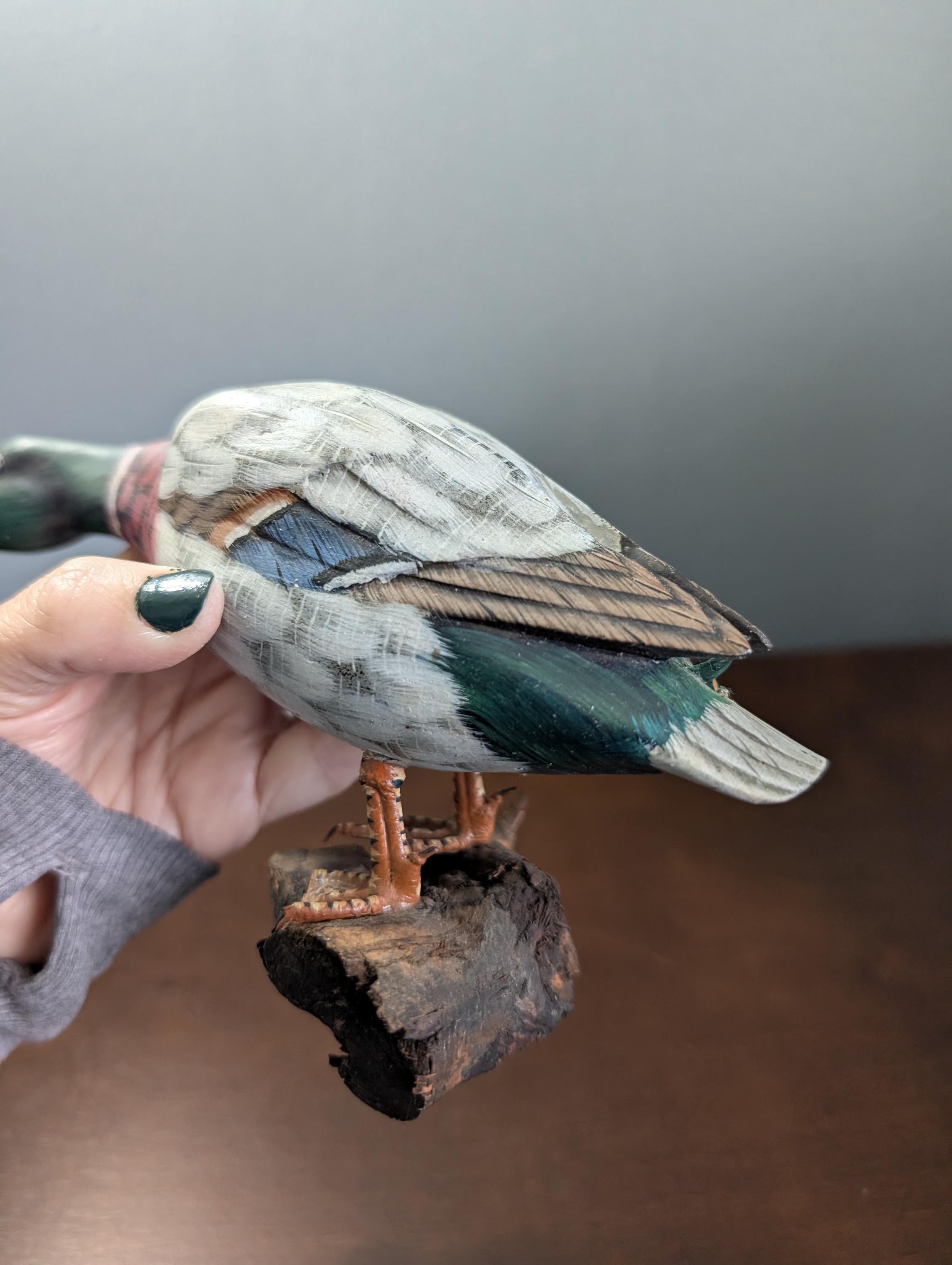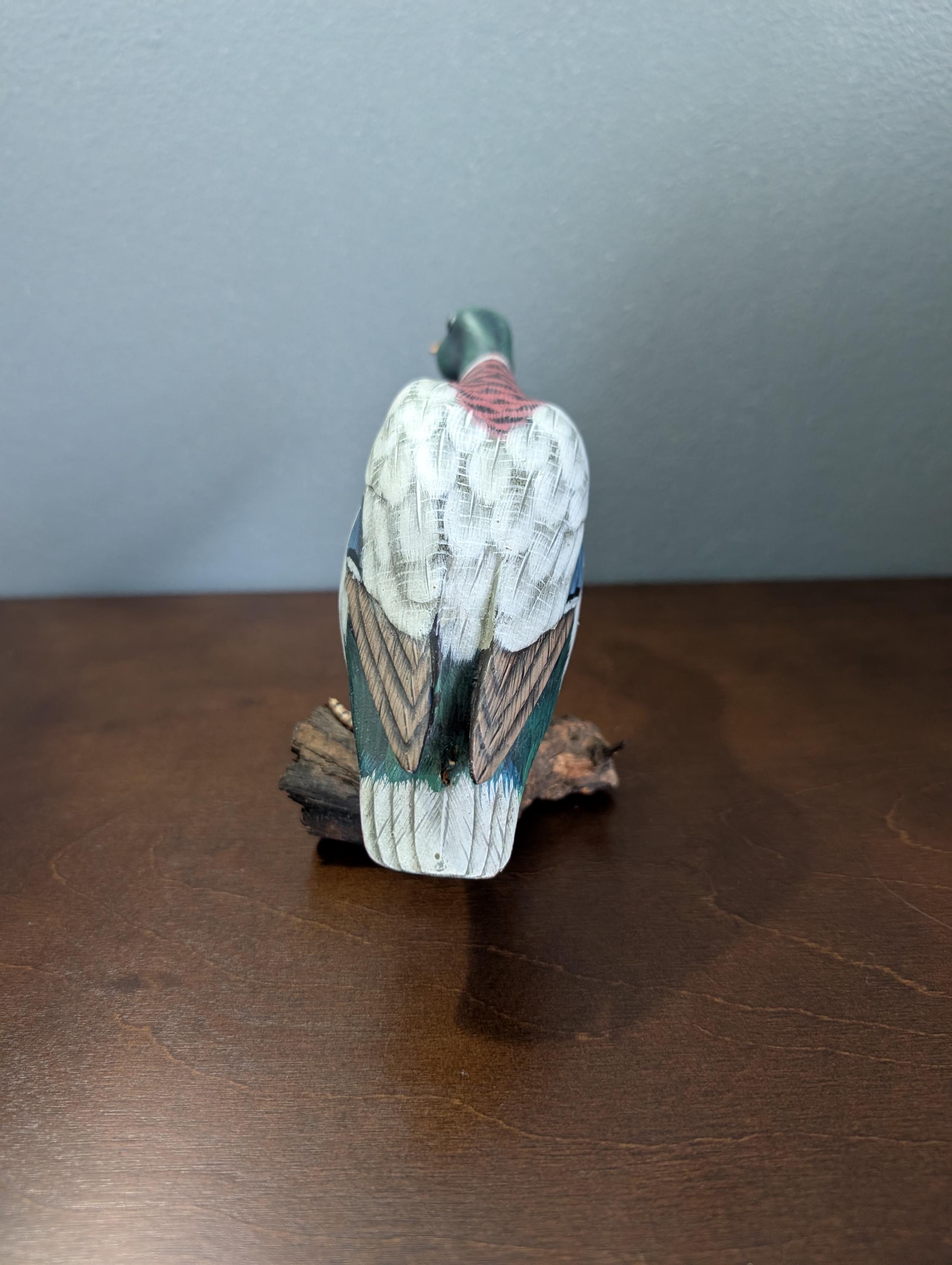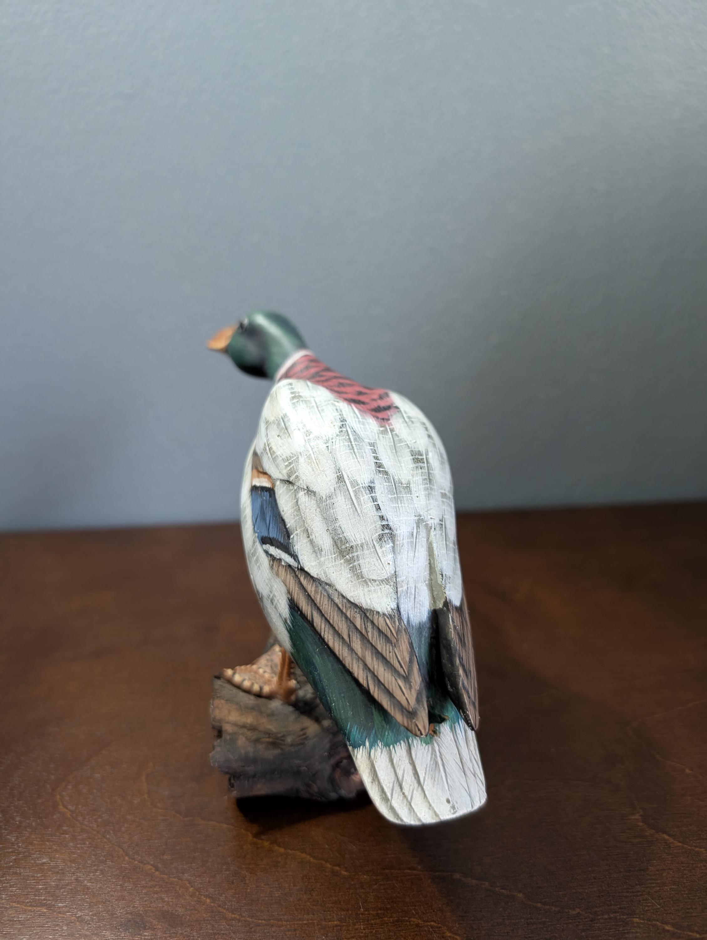 Vintage Hand Carved Wood Mallard Duck Decoy on Driftwood Base - Hand Painted Feeding Drake Sculpture - Rustic Cabin Lodge Decor