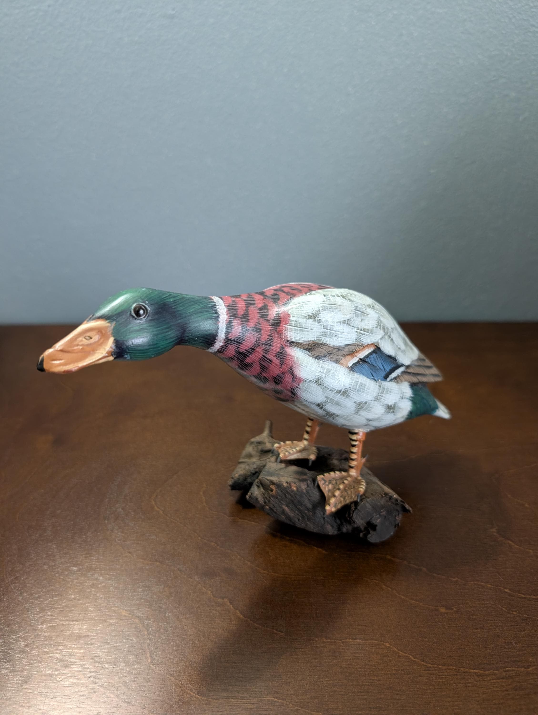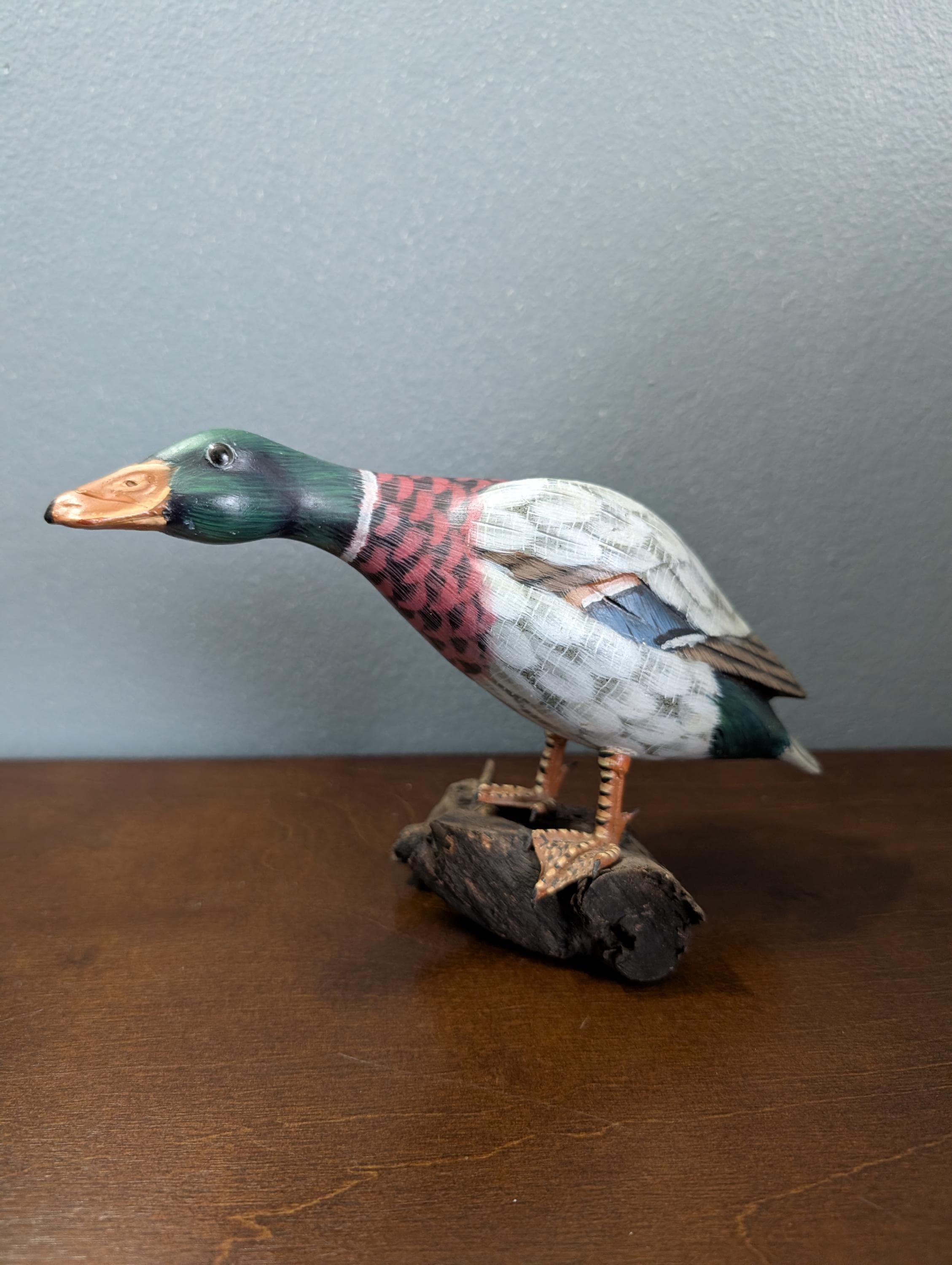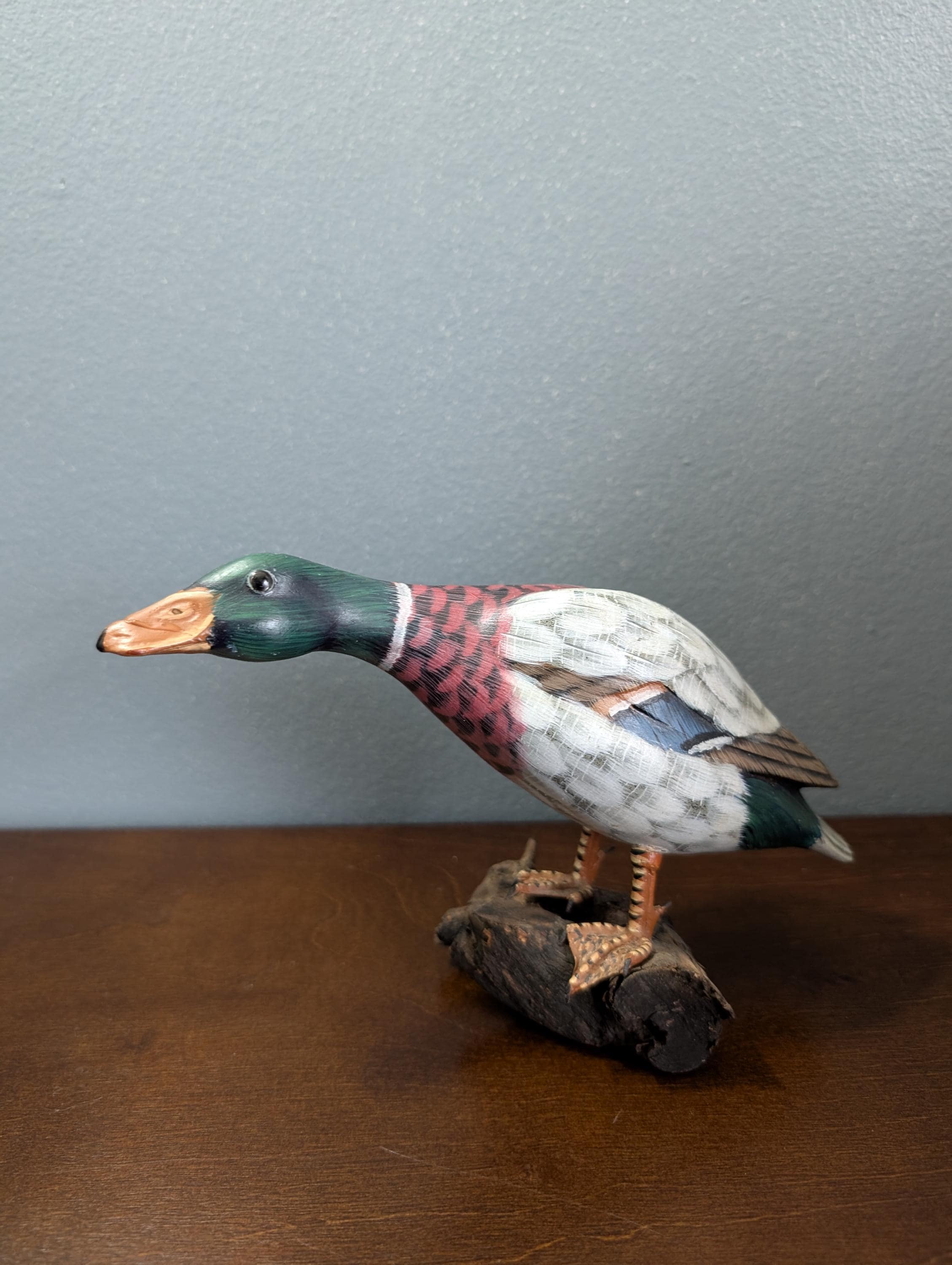 Vintage Hand Carved Wood Mallard Duck Decoy on Driftwood Base - Hand Painted Feeding Drake Sculpture - Rustic Cabin Lodge Decor