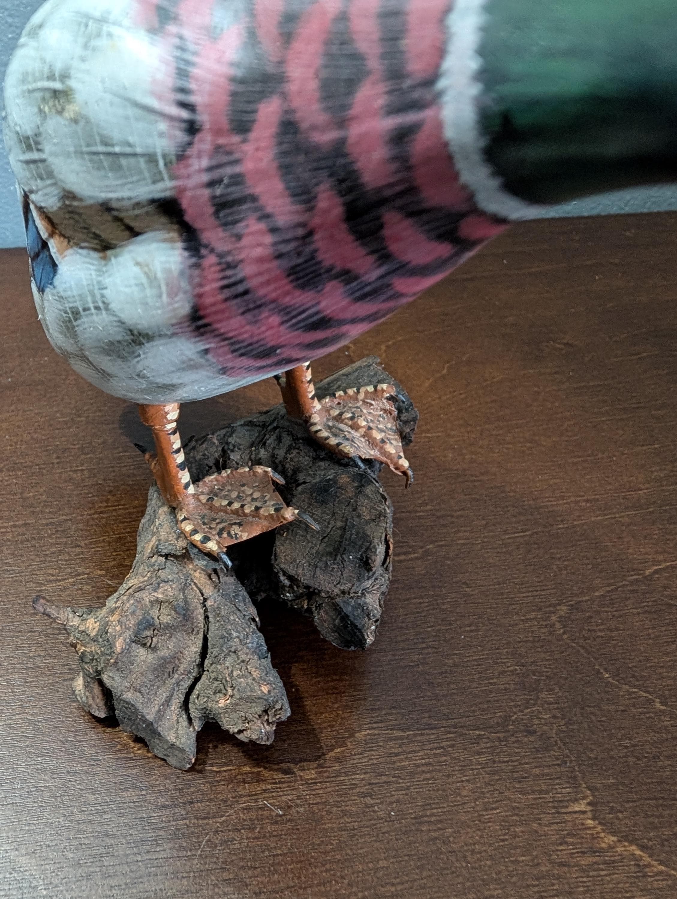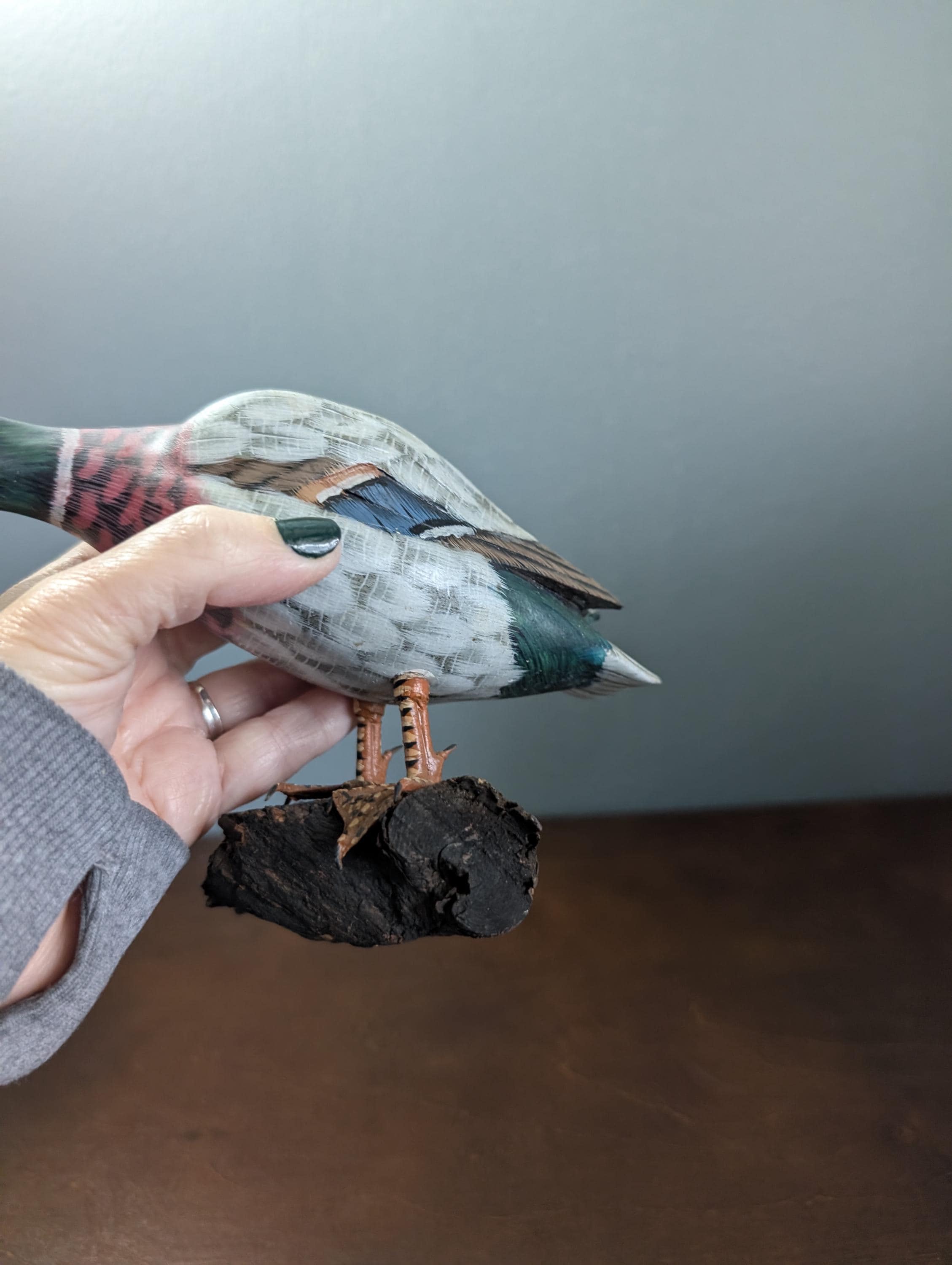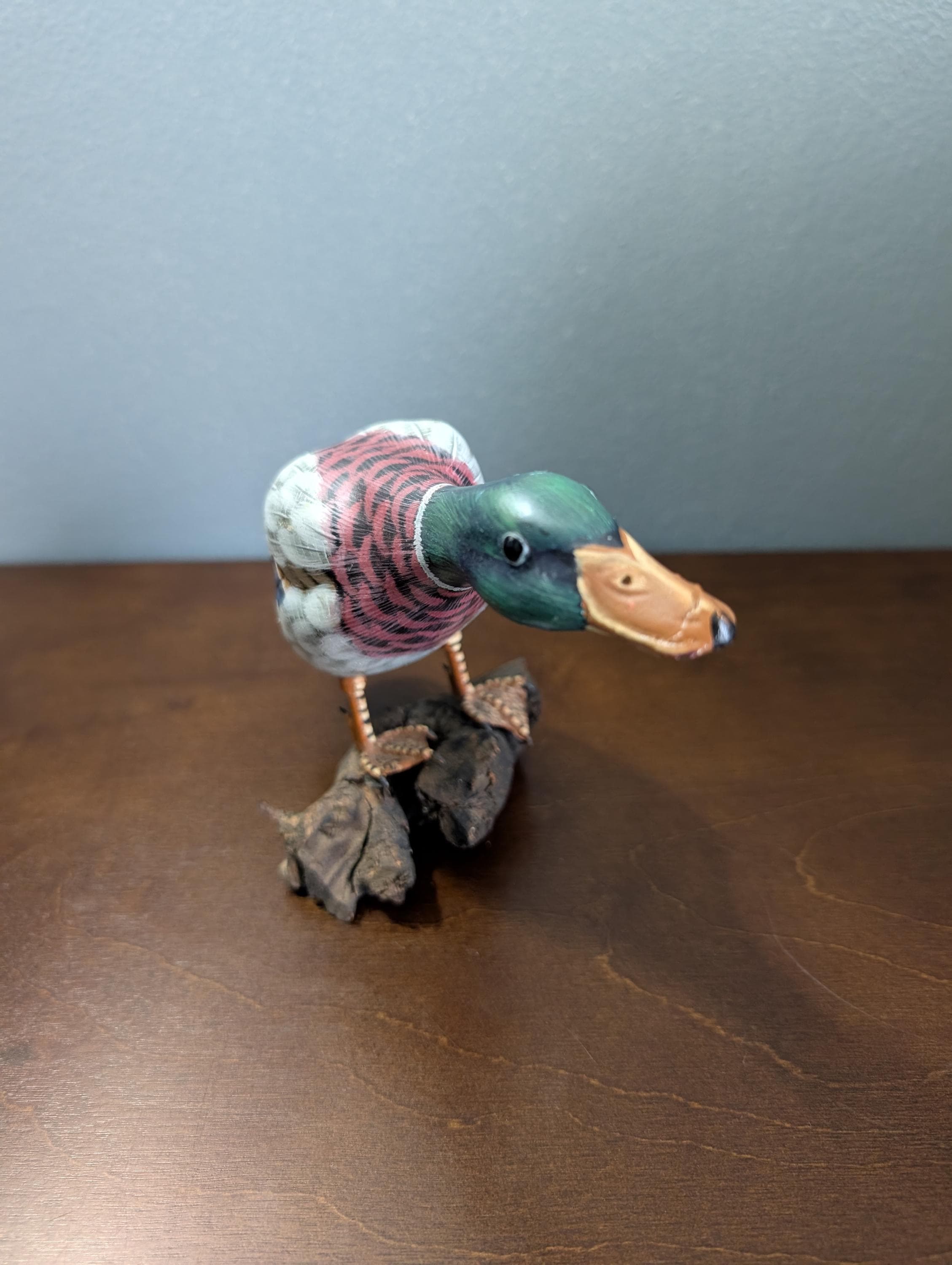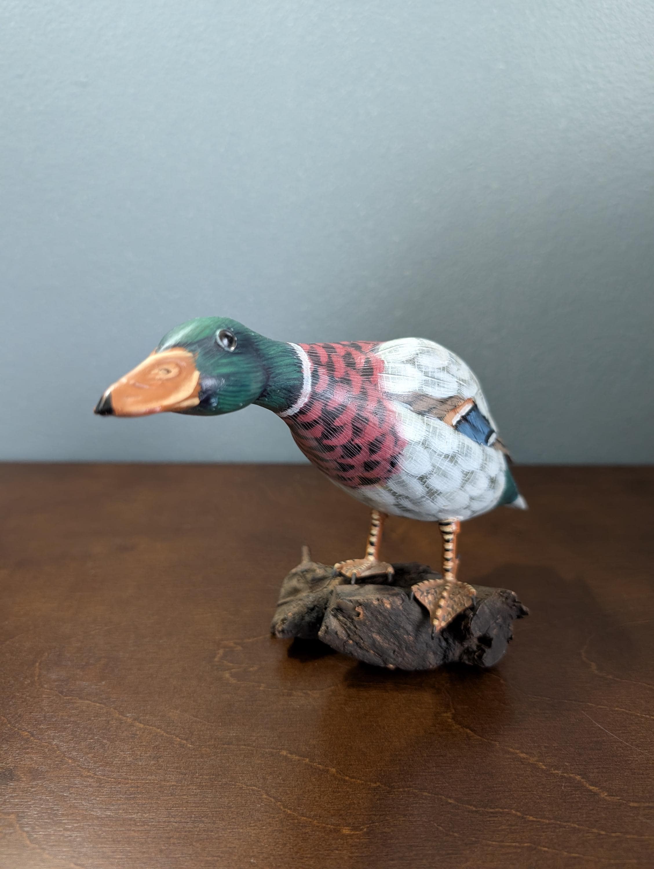 Vintage Hand Carved Wood Mallard Duck Decoy on Driftwood Base - Hand Painted Feeding Drake Sculpture - Rustic Cabin Lodge Decor