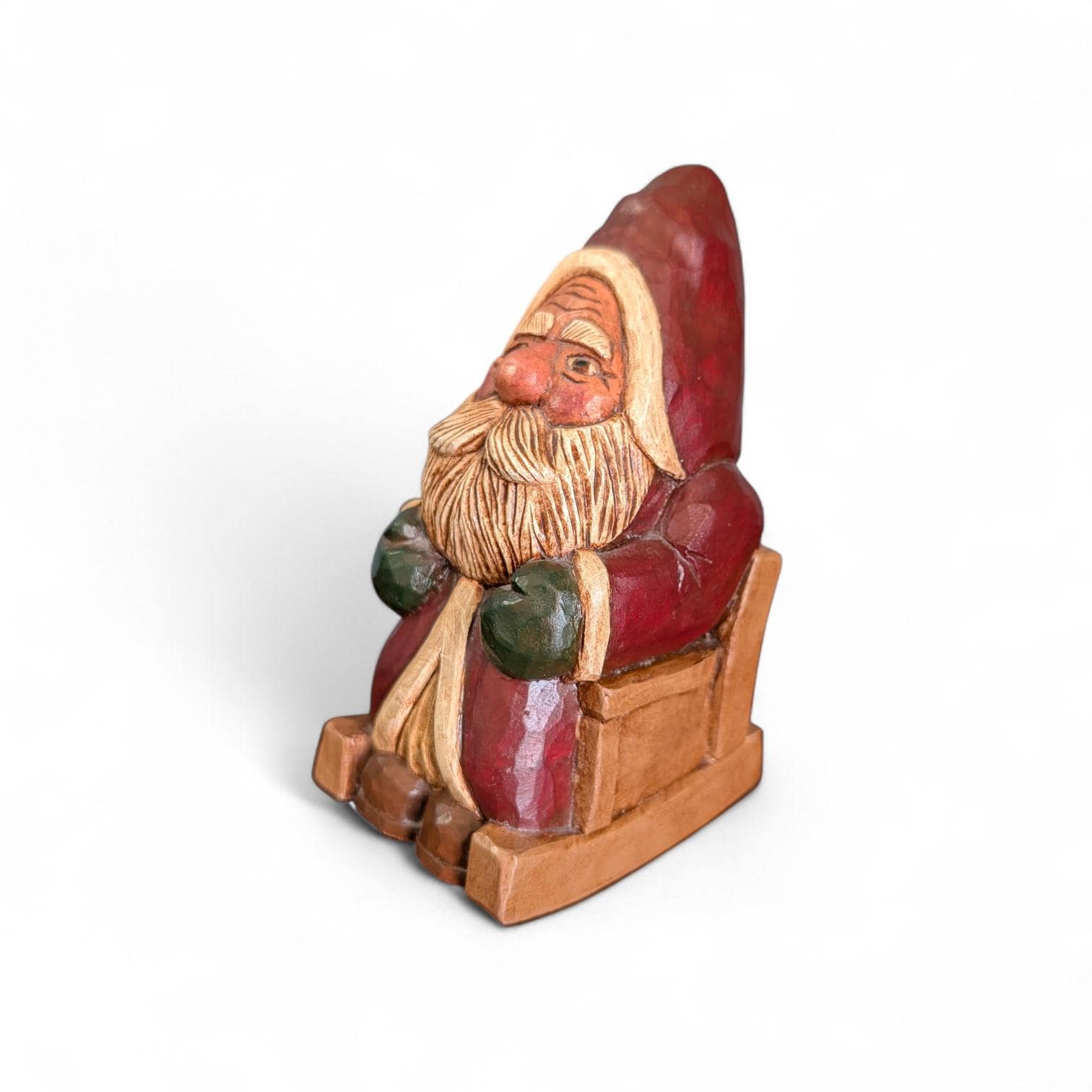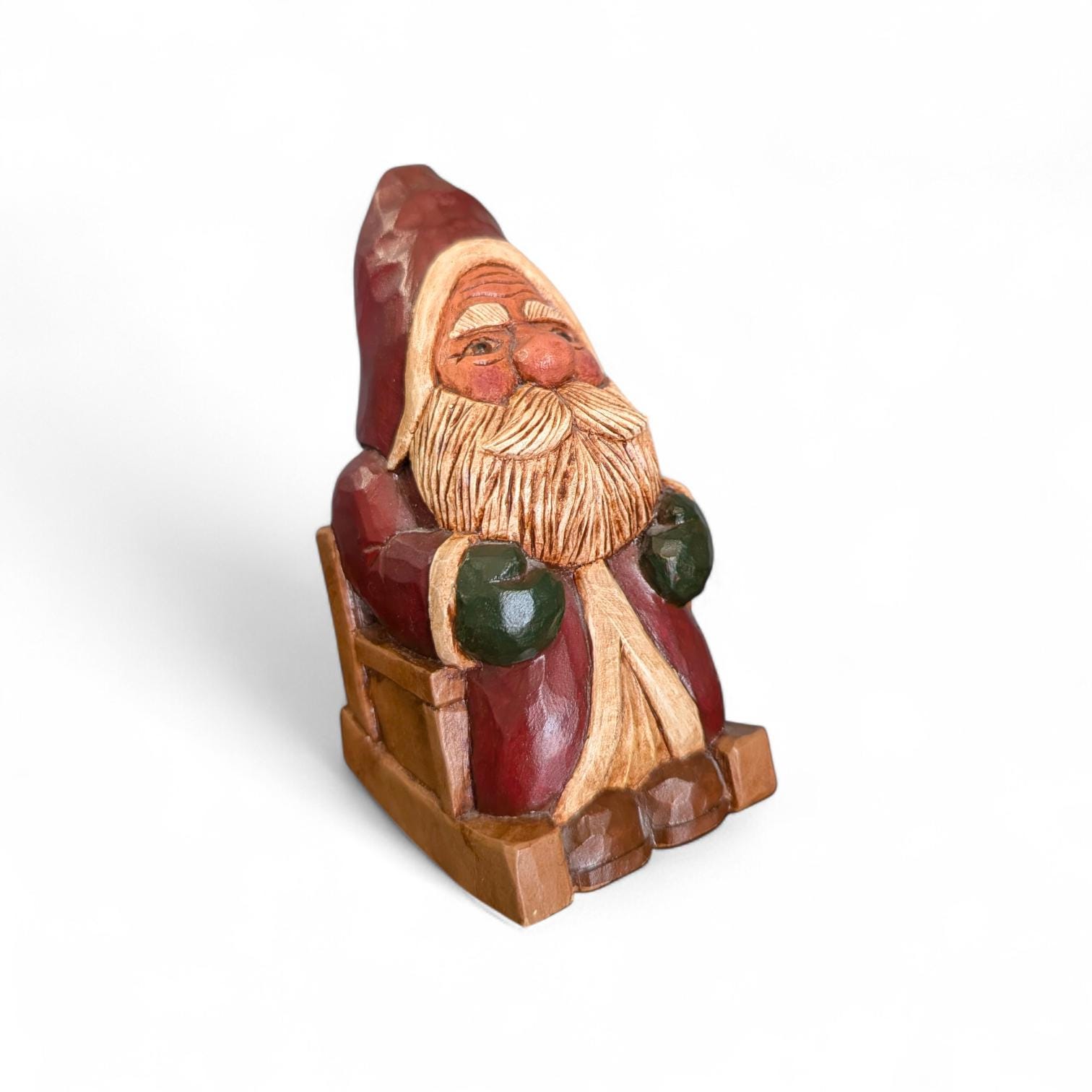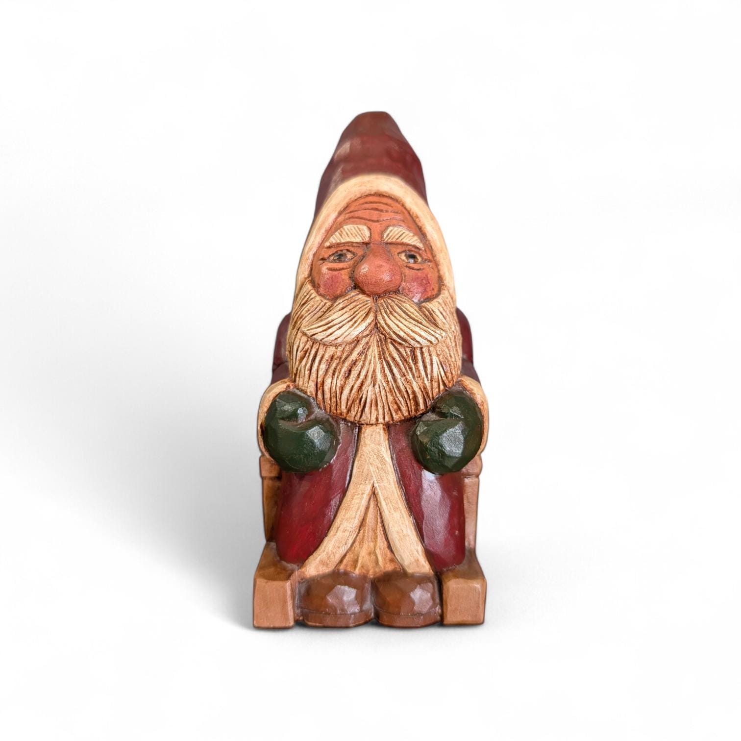 Hand-carved from solid wood, this Santa captures the "Primitive" aesthetic through its deliberate simplicity and raw textures. Unlike mass-produced resin figures, you can see the individual knife strokes and the natural grain of the wood, giving it a soulful, weathered presence that feels like it was pulled from a 19th-century workshop.Details & Materials