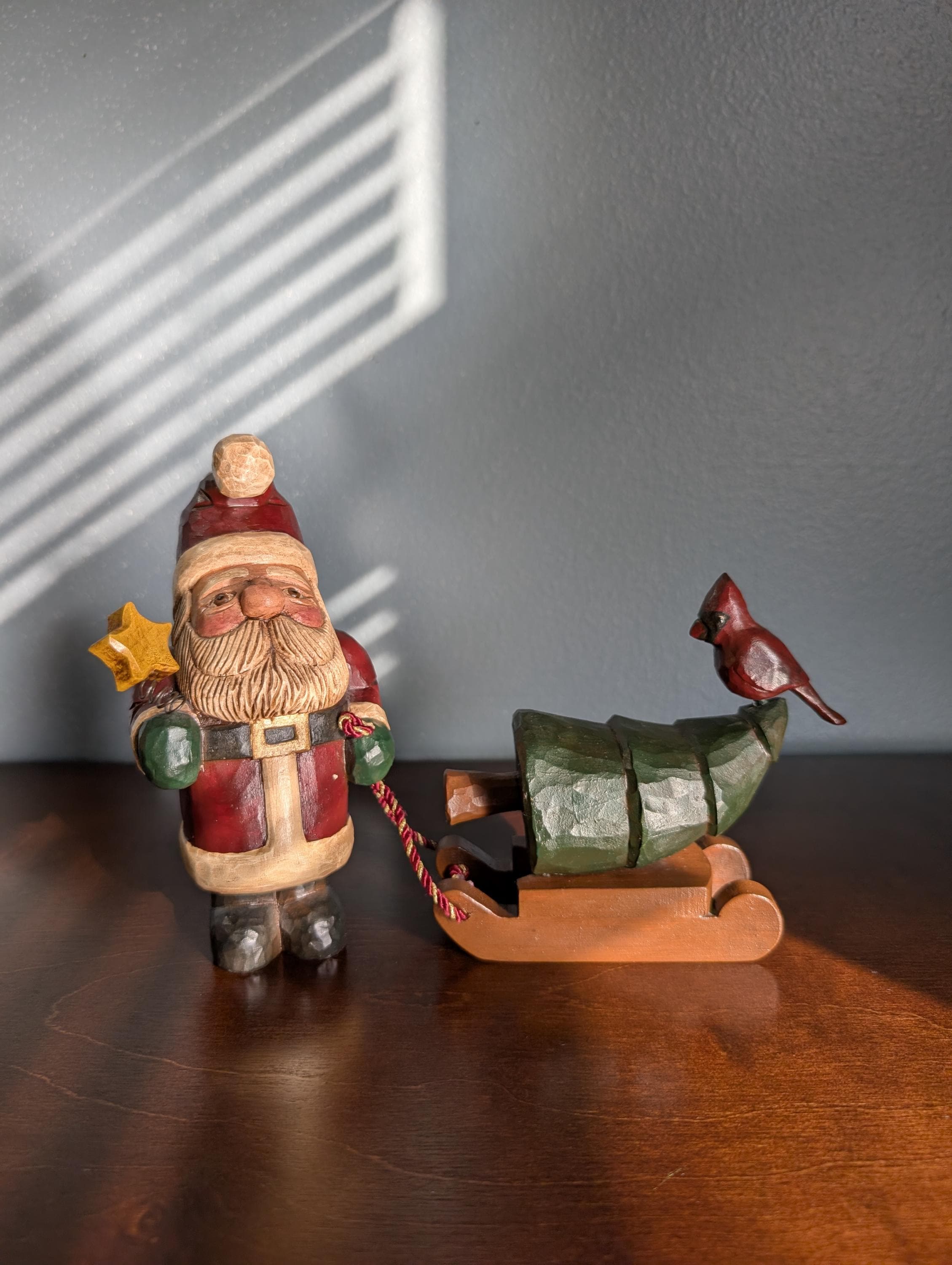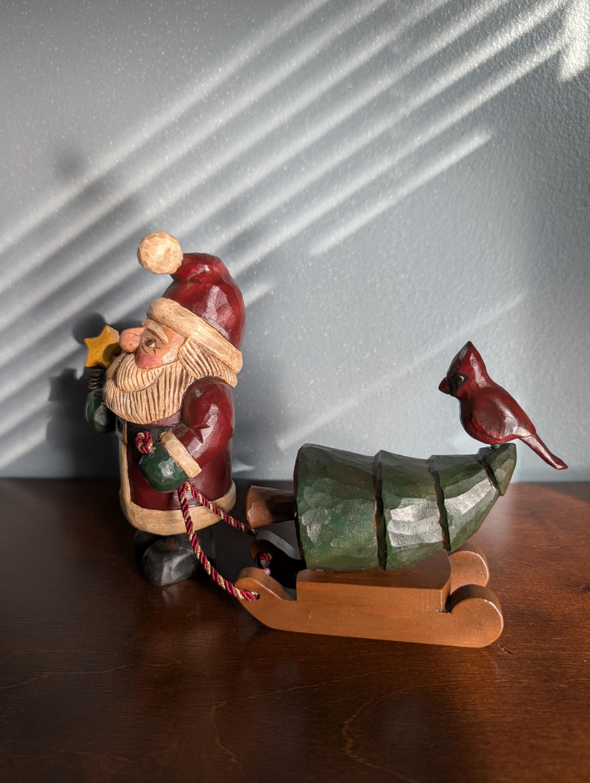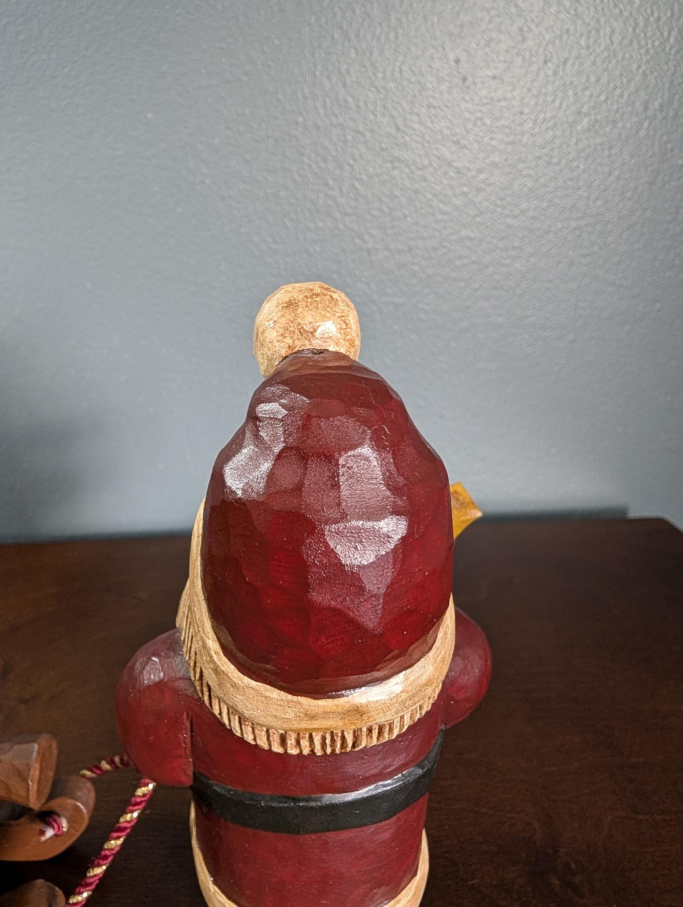 OOAK Hand Carved Wood Primitive Santa with Sled - Artist Signed Folk Art - Rustic Father Christmas Figure - Cardinal