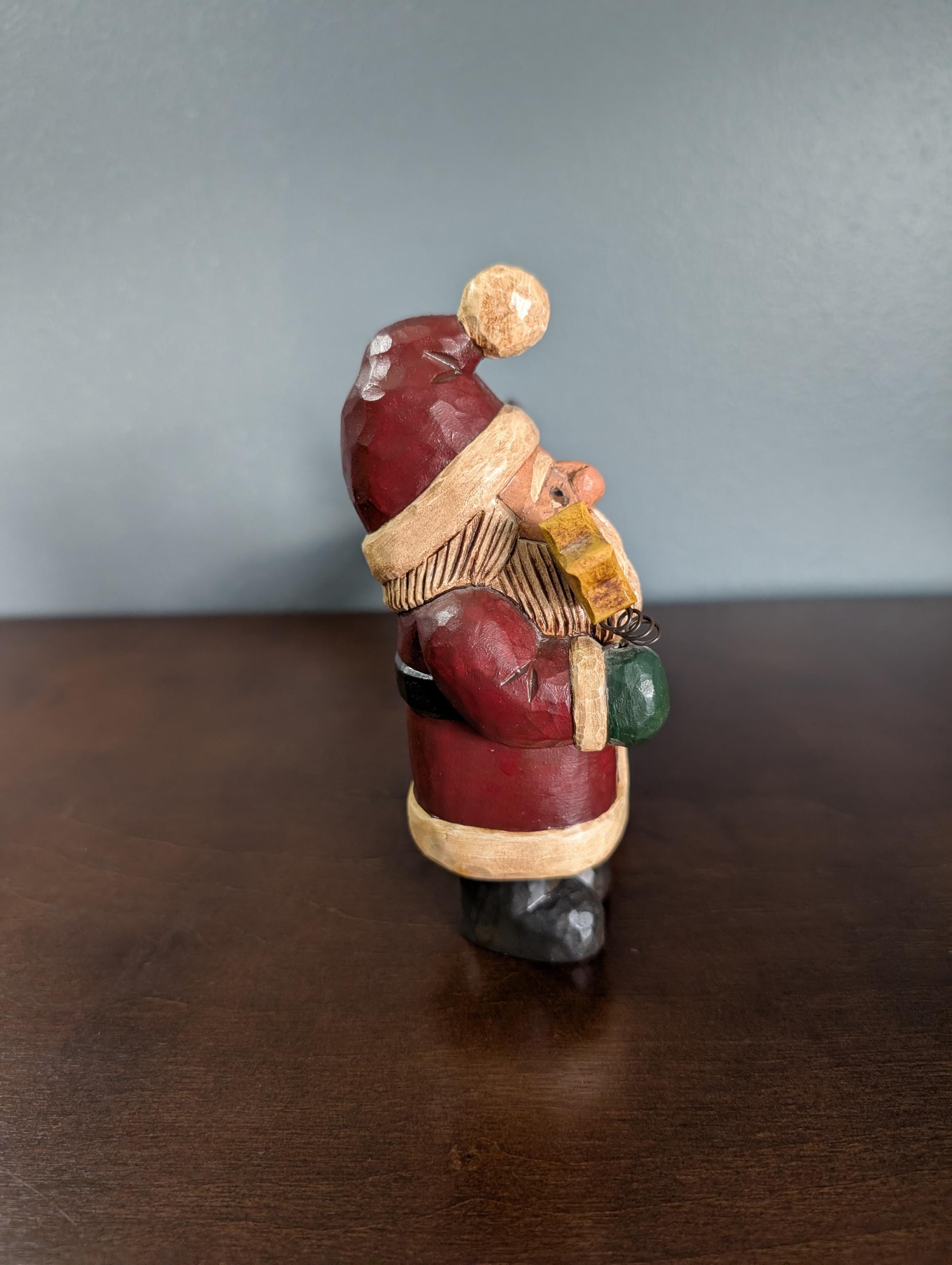 Hand-carved from solid wood, this Santa captures the "Primitive" aesthetic through its deliberate simplicity and raw textures. Unlike mass-produced resin figures, you can see the individual knife strokes and the natural grain of the wood, giving it a soulful, weathered presence that feels like it was pulled from a 19th-century workshop.Details & Materials