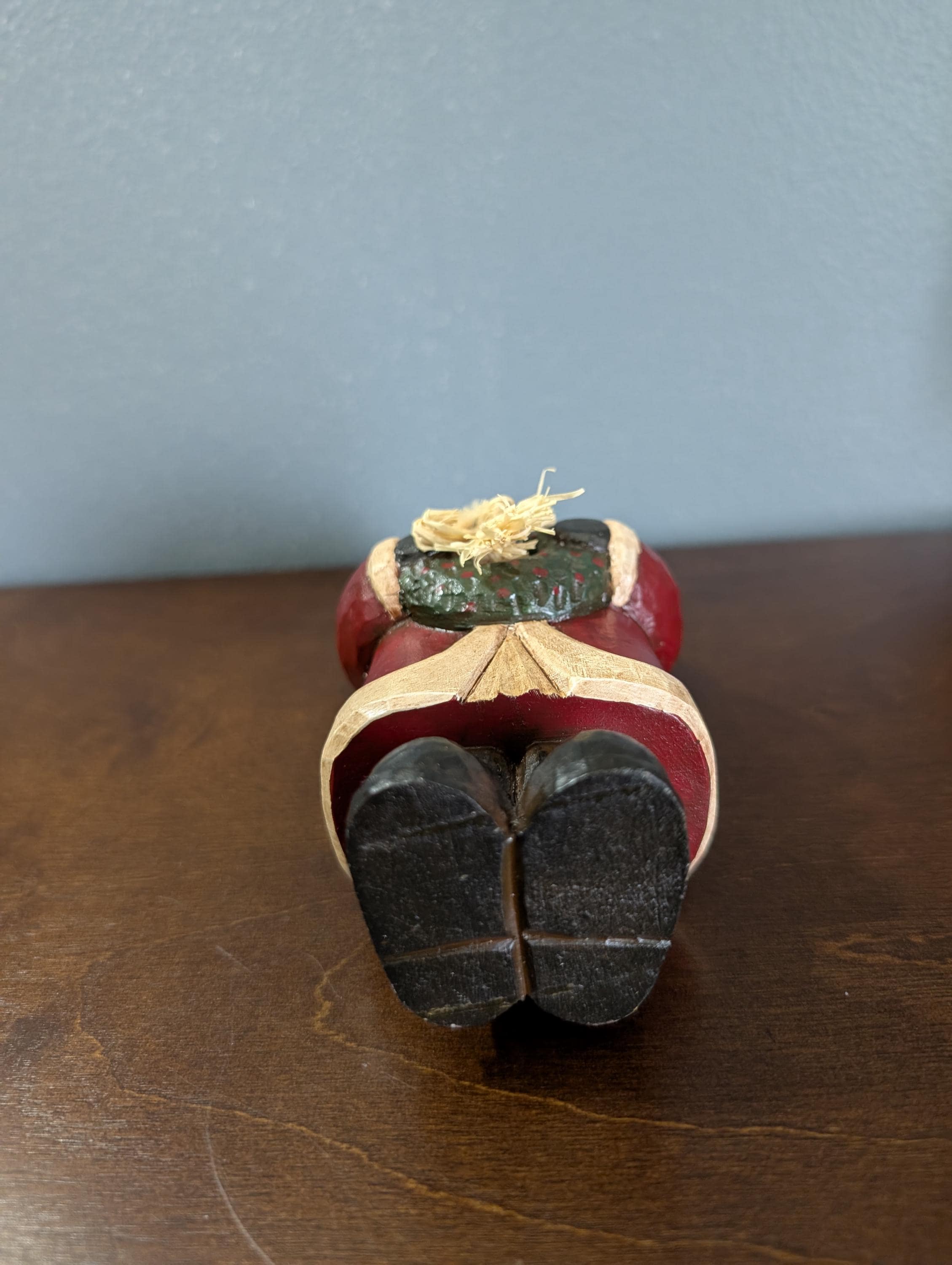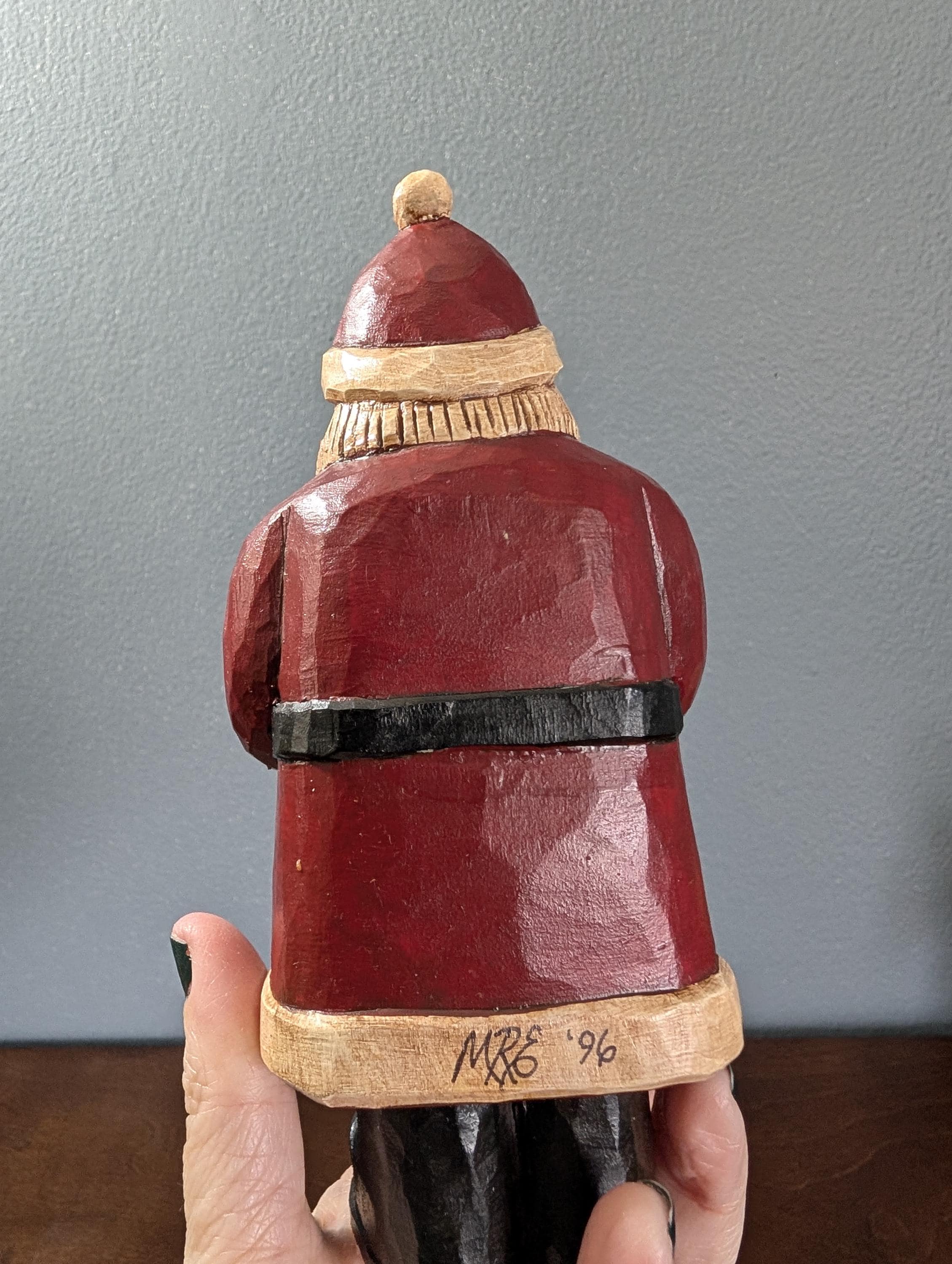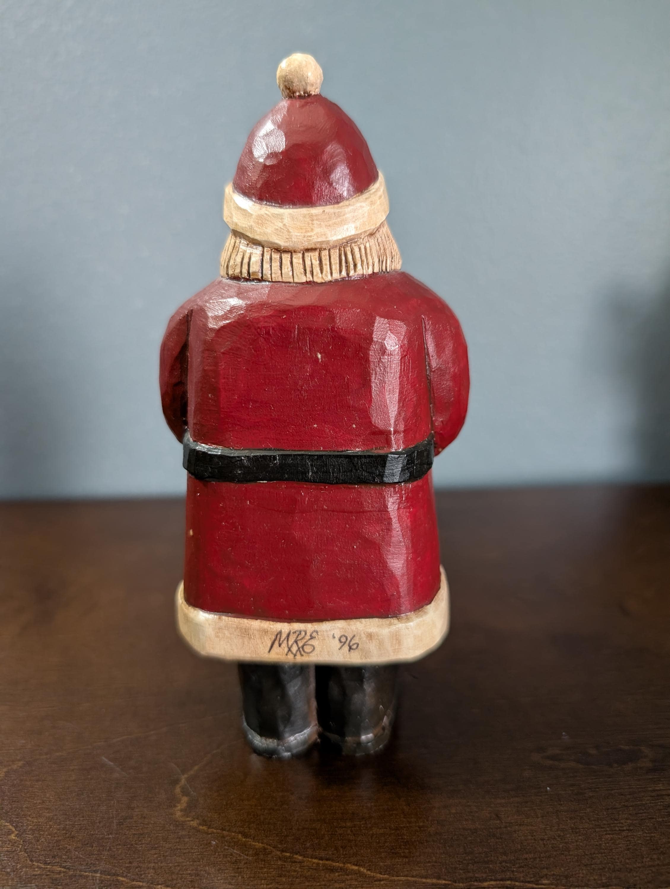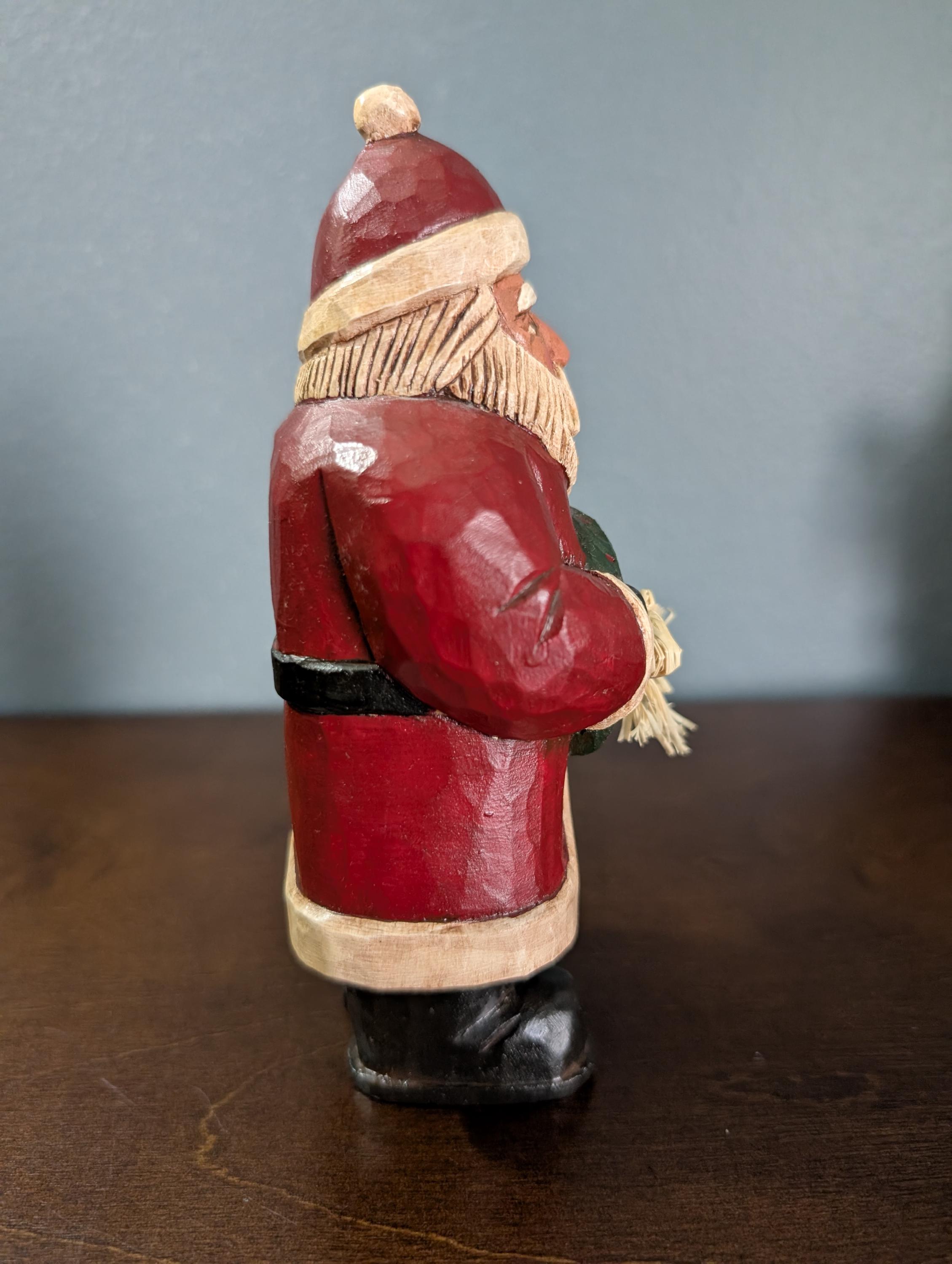Hand-carved from solid wood, this Santa captures the "Primitive" aesthetic through its deliberate simplicity and raw textures. Unlike mass-produced resin figures, you can see the individual knife strokes and the natural grain of the wood, giving it a soulful, weathered presence that feels like it was pulled from a 19th-century workshop.Details & Materials