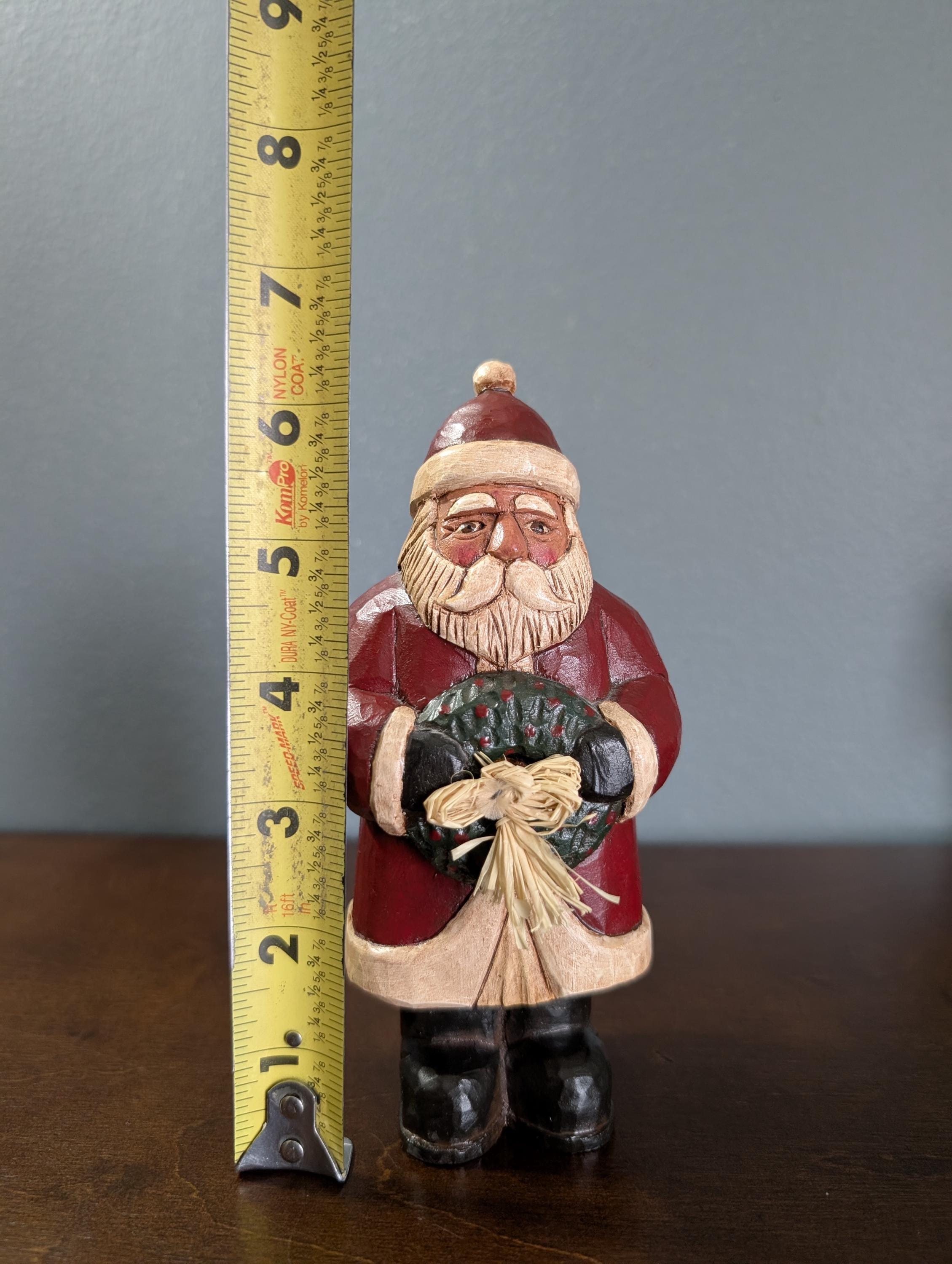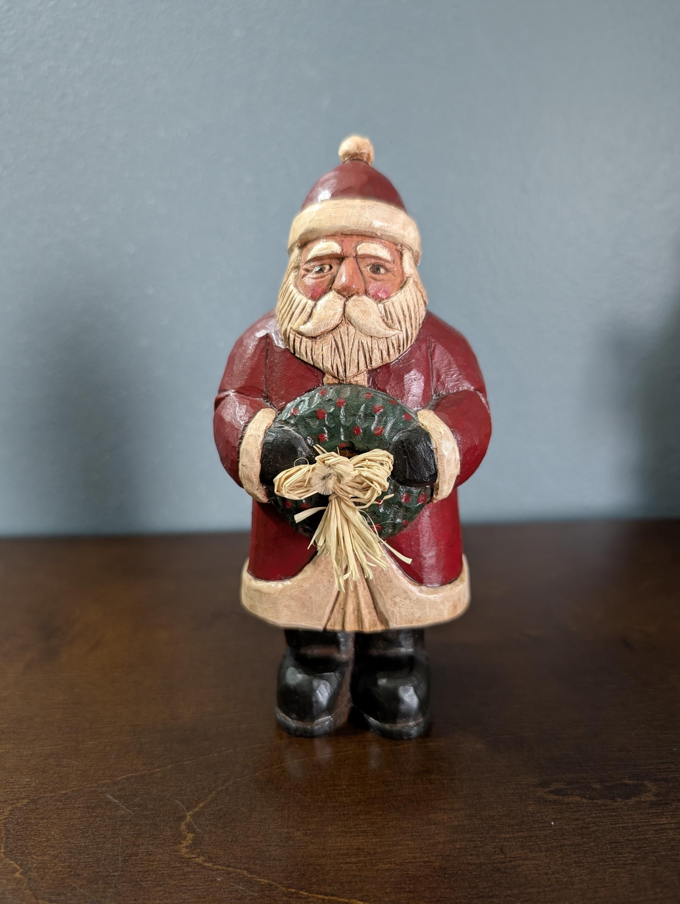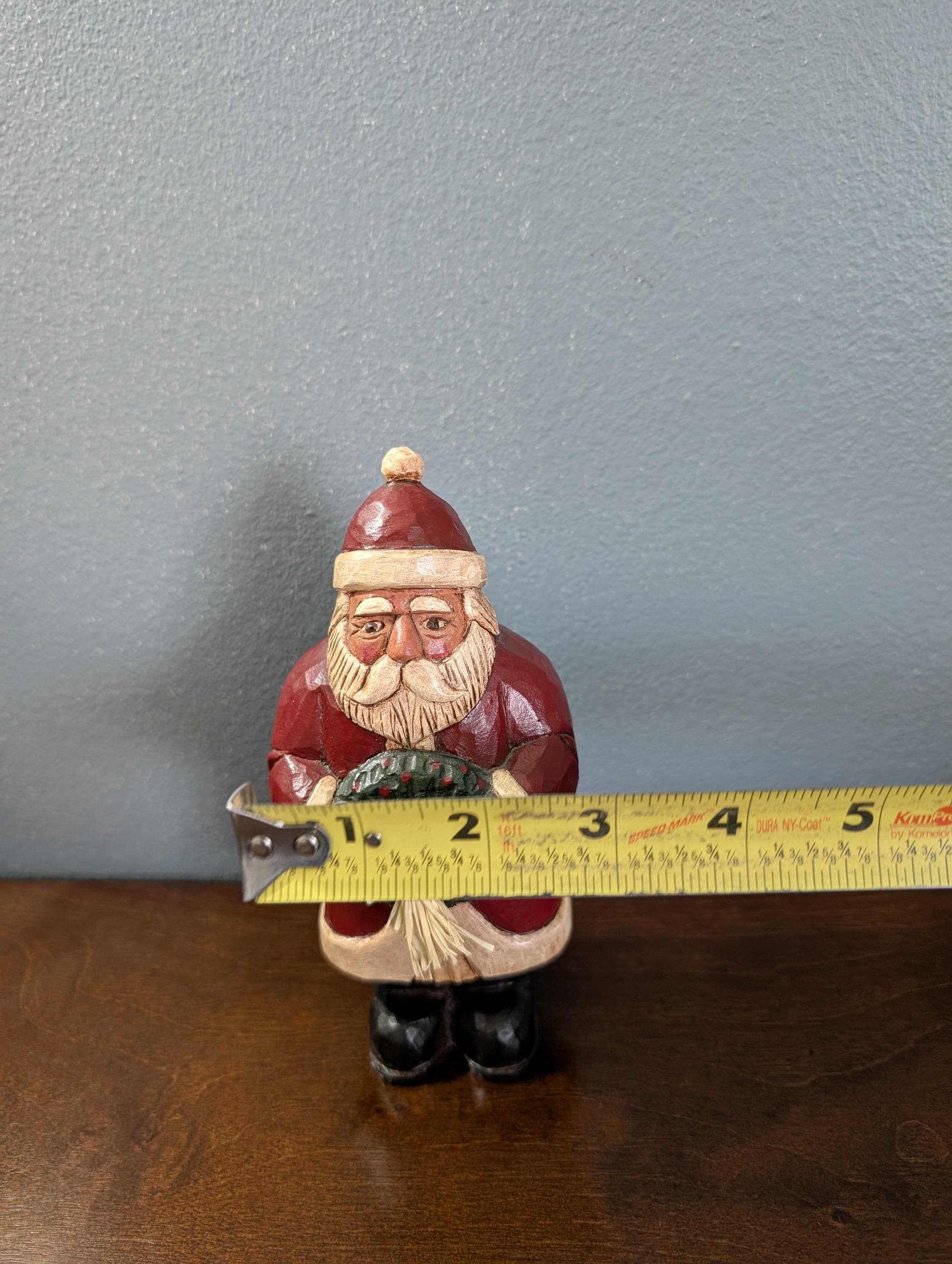 Hand Carved Wood Primitive Santa with Wreath- Artist Signed Folk Art - Rustic Father Christmas Figure