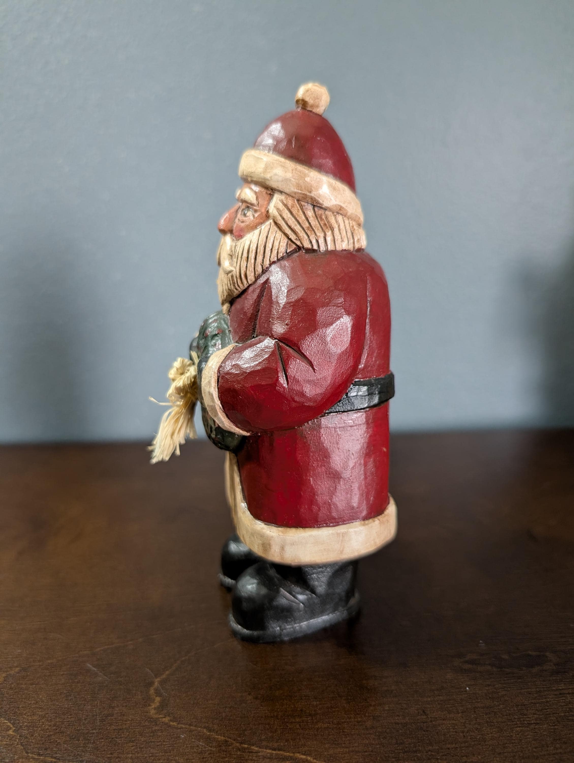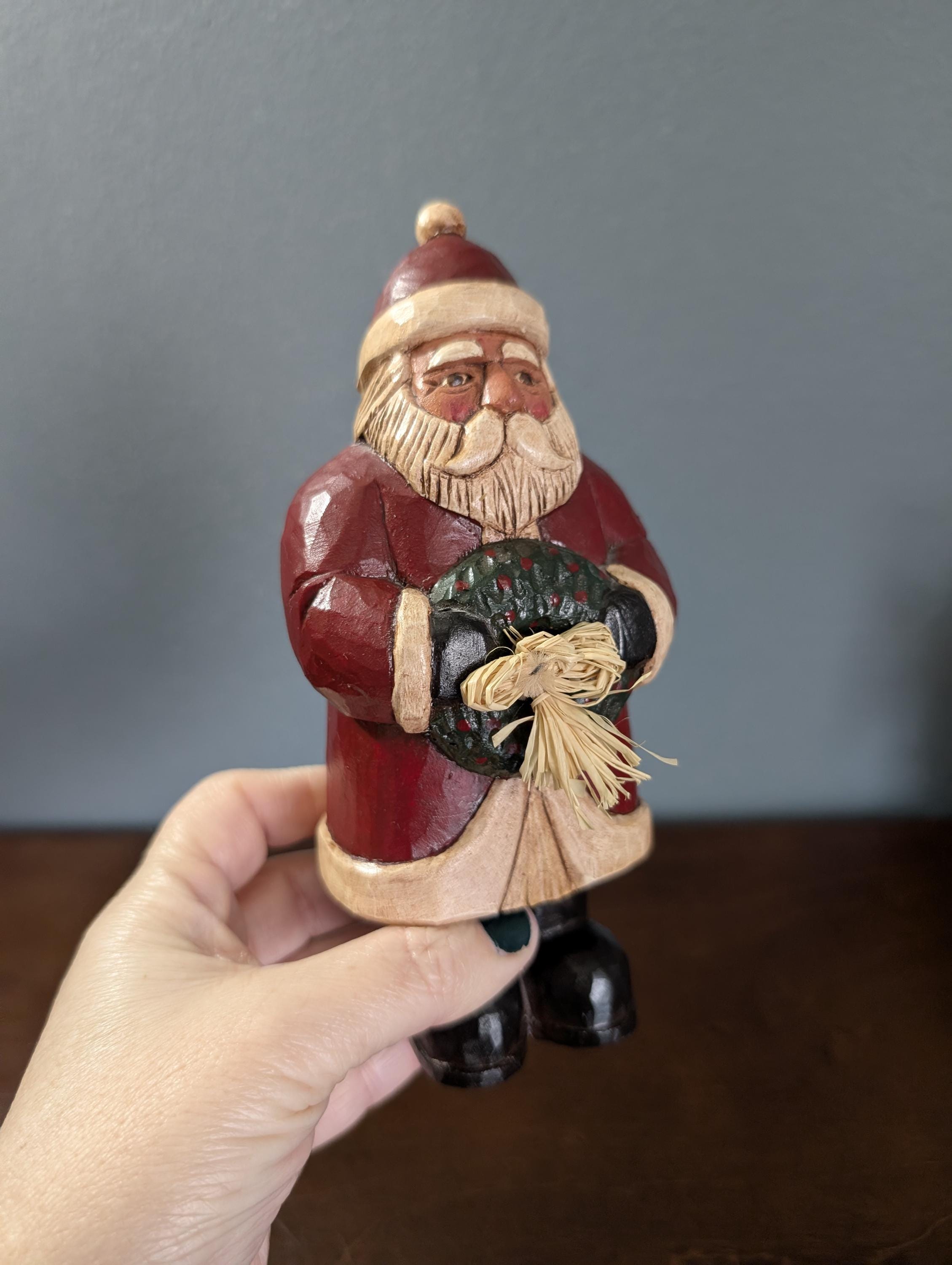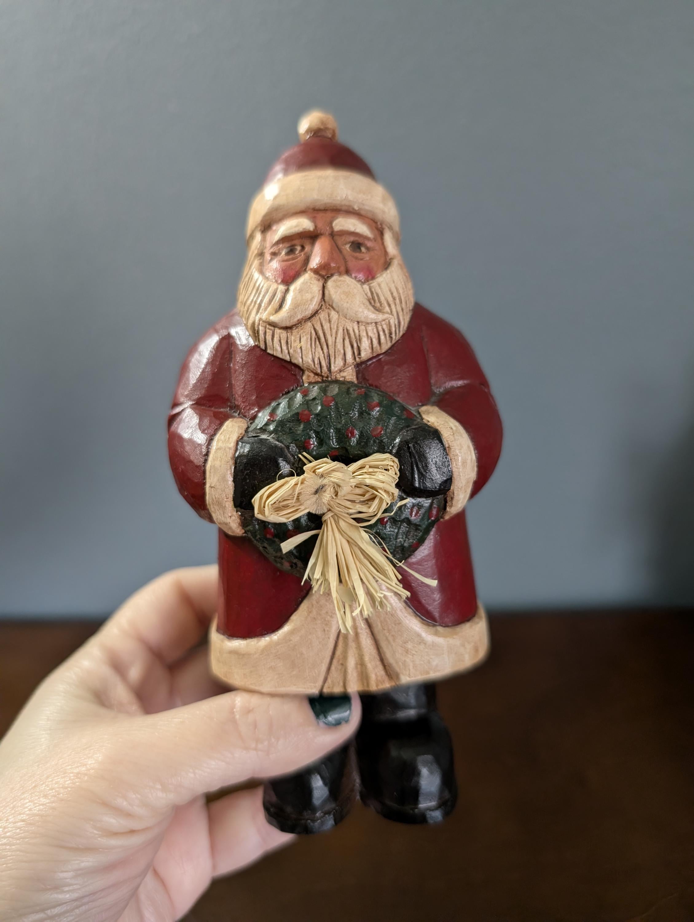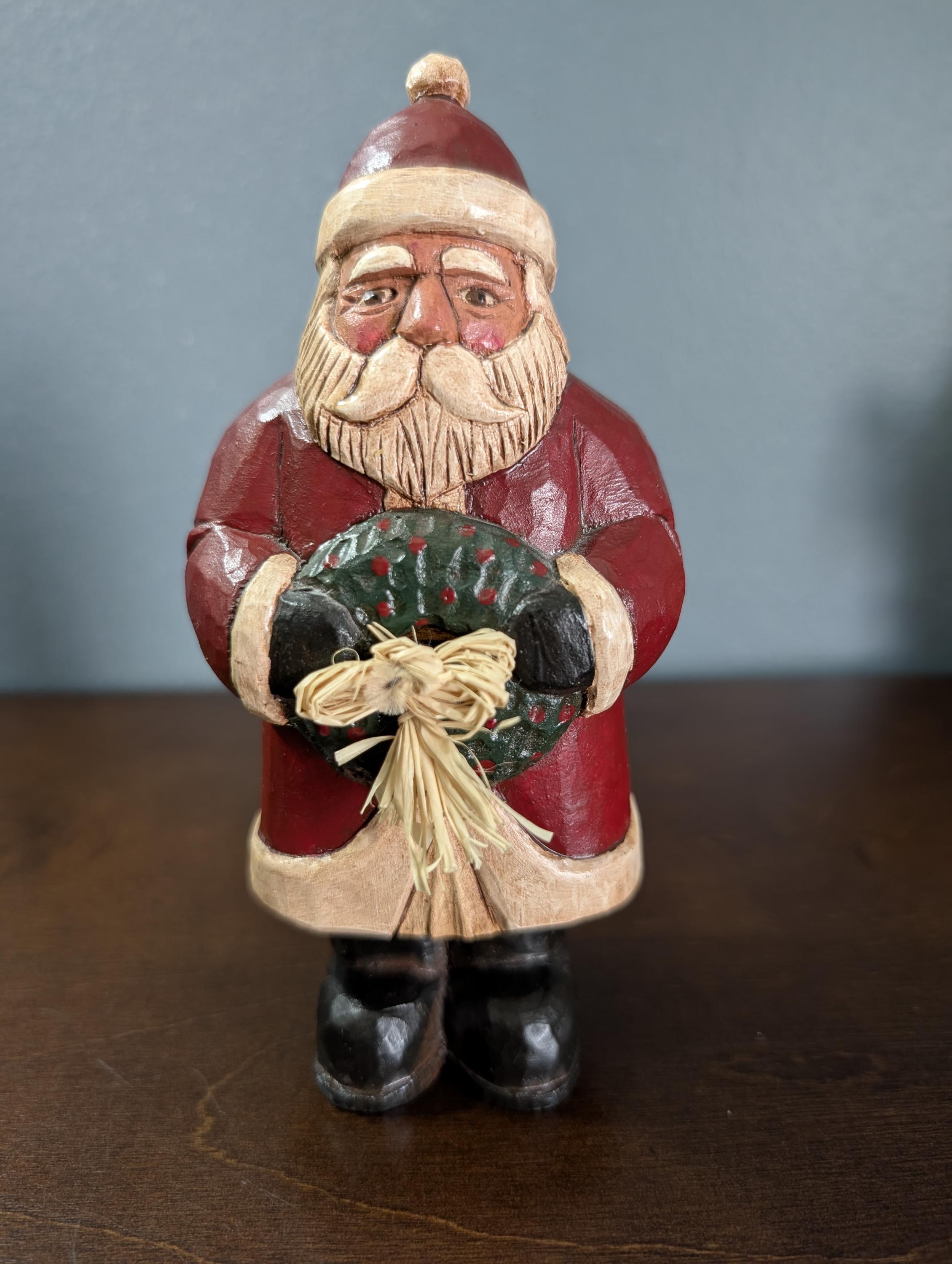Hand Carved Wood Primitive Santa with Wreath- Artist Signed Folk Art - Rustic Father Christmas Figure
